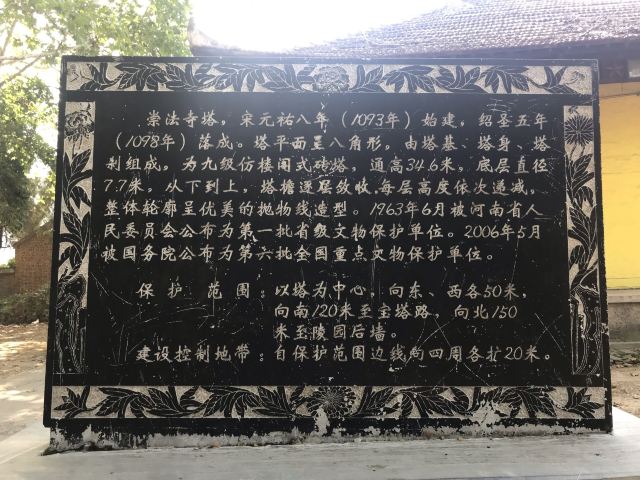 于永城县城关东北隅崇法寺旧址(今为革命烈士陵园)内。寺建于唐,塔建于宋绍圣二年(1095)。寺久废,塔刹不存。1958年修葺一新,恢复宋2代旧观。塔体现高34.6米,为省级重点文物保护单位。