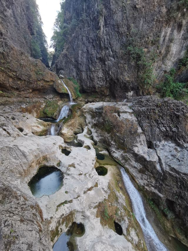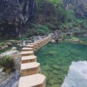 漂流的起点哈妮宫,这里河水幽清,两岸石壁嶙峋。前方有一束小瀑布,那是哈妮宫瀑布。牛路河大桥是漂流的终点,也是综合性的服务区,漂流完后的游客可以从这里上岸乘车返回起点处。