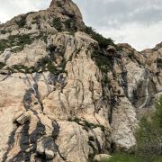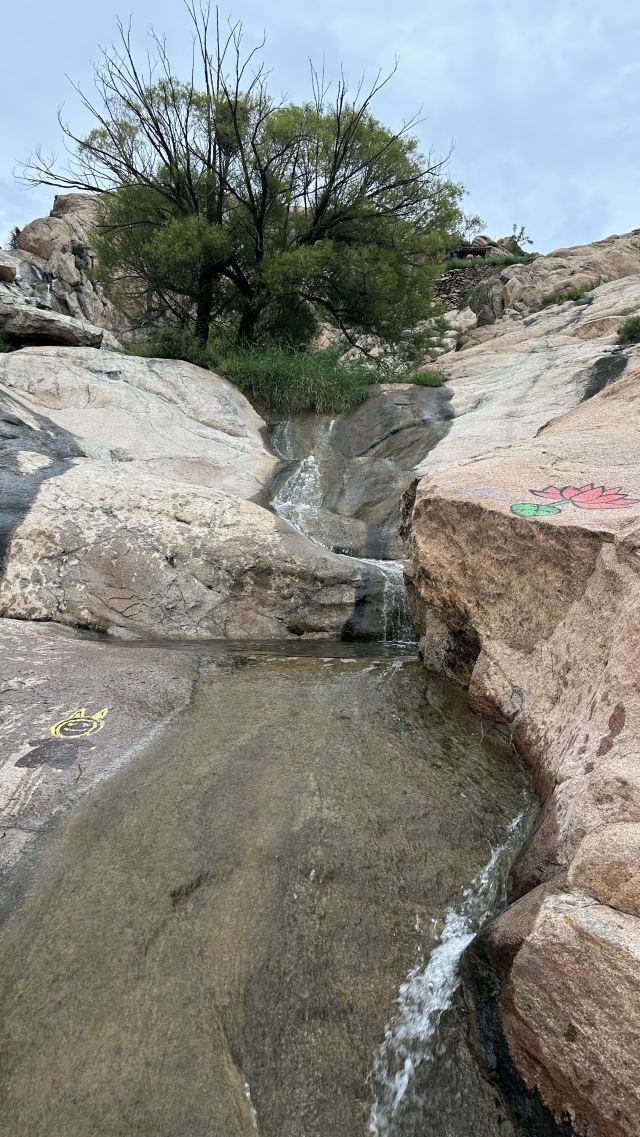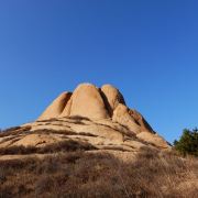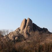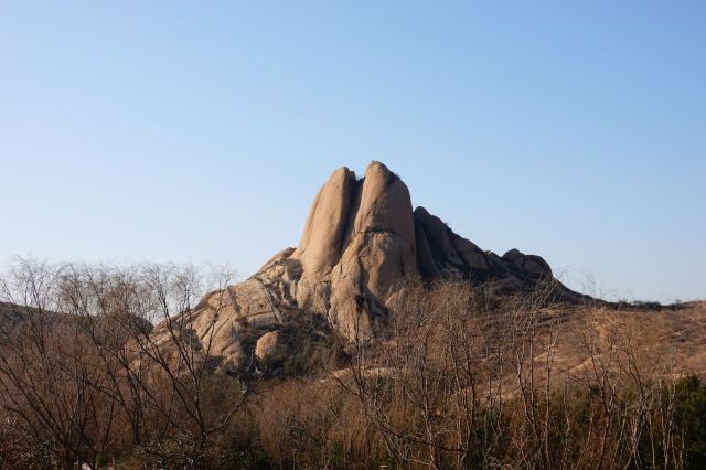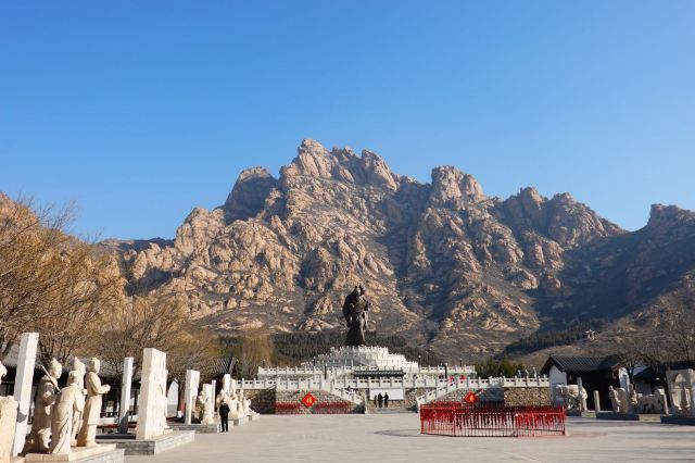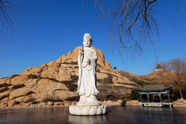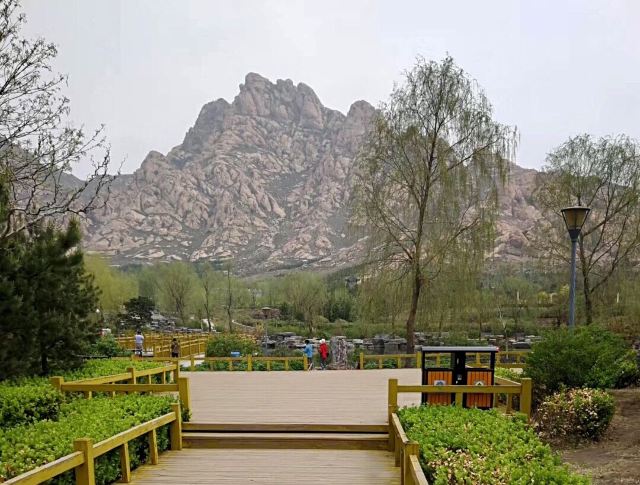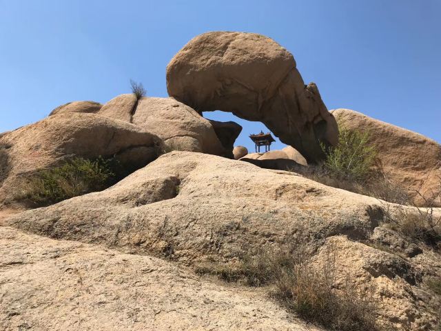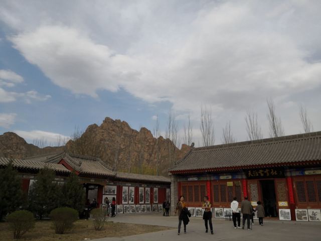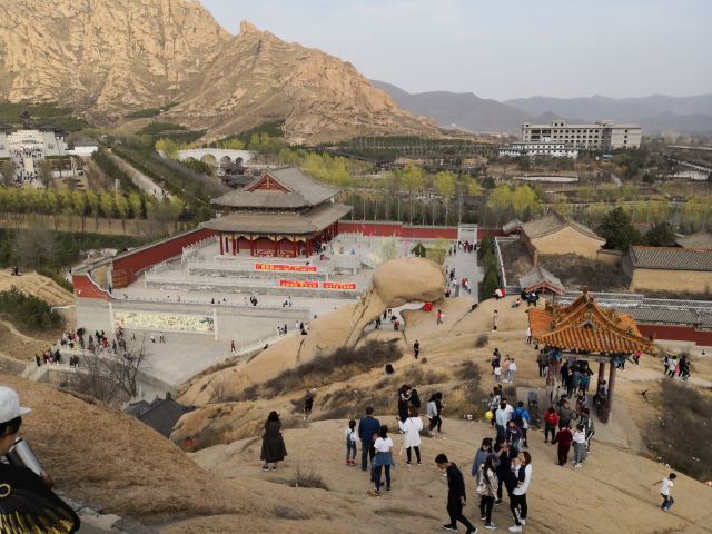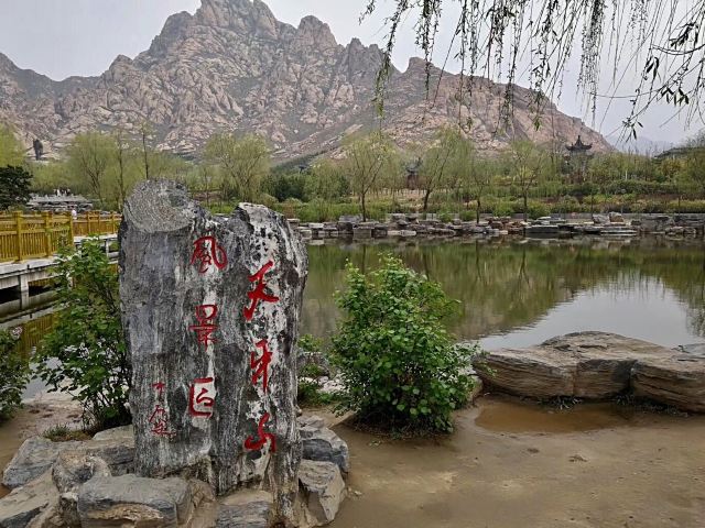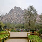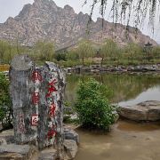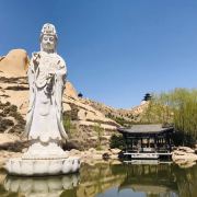 出原平口下高速东行过滹沱河桥,约五公里就到了天牙山,奇怪的是百度搜索明明是天涯山,到景区看到牌匾上赫然写着的却是天牙山几个字。天牙山由一系列怪石嶙峋的山峰组成,山势连绵蜿蜒,山头巍然挺立,整座山脉砂岩裸露,草木极少,最西边的一座峰,峭壁耸峙,山头劈作数瓣,正面看若莲花之蕊,侧面看又如朝上收握的五指,莲花峰麓有一哑铃状石头斜搭在大而平的石头上作敲鼓状,当地人为此将一座祠堂改以石鼓命名,据说崞县志记载:元代张显之夫人延氏,娘家介休县。延氏乐善施舍济贫,在莲花山下大路旁建舍药院,并供奉绵山介子推神灵保佑。一天夜里忽闻人语马嘶,隔窗闻问,答曰介神驻兵。翌日见院内石上留有蹄印,遂将舍药院改为介神行宫,此即石鼓神祠之前身。莲花峰向东再往南是一座宽广的扇面形石山,鱼鳞般布满凸石的峰峦就像怀抱一样把介子推背母像紧搂在身前。塑像前方是碧波荡漾的如意湖,湖旁杨柳依依,掩映着造型别致的亭阁桥廊,为景区增添了几分诱人的江南神韵。