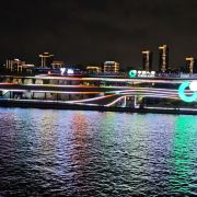 微信小程序滨江码头登船,途经钱江龙-杭州印-西兴大桥-奥体中心-钱江世纪城-欣赏钱江新城灯光秀-杭广电视台-远眺复兴大桥-钱王射潮-返回滨江码头,感受“月到天心处,风来水面时”的闲适惬意,尽情领略霓虹下的新城两岸高楼天际线,让你度过一个难忘的盛世钱塘江夜游之旅。钱印号:融入杭州钱塘文化元素,而且兼具多重旅游功能。顶部飞檐的设计,用中国传统建筑檐部形式,展现出若飞举之势。游船采用大开间的玻璃窗,以增加通透感,将千年古典文化与现代时尚气质融合再造,使游客在乘船途中追寻城市记忆,感受到“一山一水梦天堂,一船一景游故乡”的意境。梦航号:融合杭州现代建筑的时代元素与灵动特点,打破传统客运船舶设计理念,把丝绸用现代结构的方式写意处理,完美诠释流淌的千年古典文化的艺术美与时尚的现代气质间的融合。游船分为三层,一、二层为室内舱,第三层为开放式观光平台。整船采用柴电混合环保推进系统,能有效减少燃料使用和PM2.5、废气等排放,大幅降噪减振,提升乘坐舒适感。钱塘江——浅浅的月光下,想起张若虚,想像能走进他的《春江花月夜》:“春江潮水连海平,海上明月共潮生。滟滟随波千万里,何处春江无月明……江天一色无纤尘,皎皎空中孤月轮。江畔何人初见月,江月何年初照人……”没有嘈杂的游客,也没有各种不同的观光者,在两岸灯光的映射下,一艘游轮也可以这样,承载一份静谧的小高级。