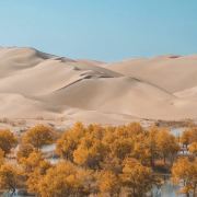 葫芦岛的胡杨、湖泊静卧于大漠怀中,深秋时节,一夜寒露,会骤然把湖泊边、沙漠中的胡杨树全部染黄,在湛蓝的天空下,呈现出一片灿烂明媚,宛如大漠的桃源仙境。