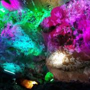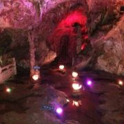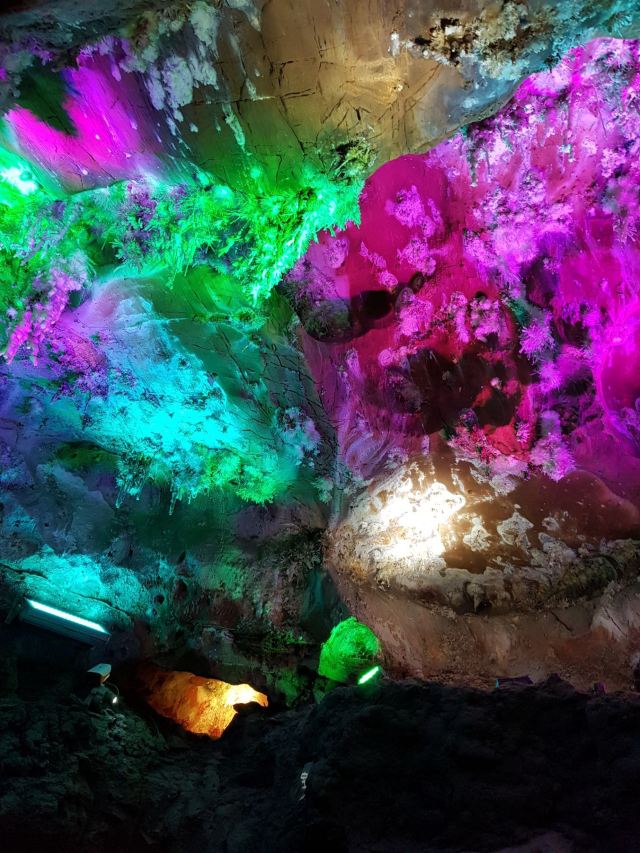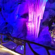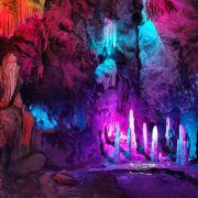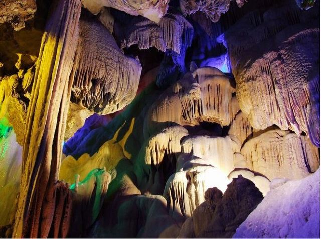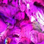蟠龙洞位于云浮市北部的狮子山中,因其洞身曲折蜿蜒,形似蛟龙而得名。蟠龙洞是一座有着1.7亿多年历史的次生喀斯特溶洞,全长约520米,共分三层,上为天堂通天洞,下为龙泉地下河,中为九龙长廊,各有奇峰异石等独特景象,钟乳石、石笋层出不穷,又在五彩灯光下变幻出光怪陆离的缤纷姿态,使其间游人有如身临瑶池仙境的奇妙体验。