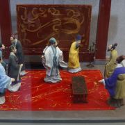 这间茅庐前是一个小院子,当你进入茅庐后,映入眼帘的是正面墙上悬挂的陈寿(《三国志》作者)的“隆中对”木刻匾额,侧面的书案旁,诸葛亮和刘备的塑像栩栩如生。茅庐附近建有武侯祠,在祠中的大堂内端坐着诸葛亮的雕像,在祠中还有很多蜡像,再现了当时诸葛亮的一些生活场景:读书、躬耕、交友等。武侯祠边上就是三顾堂,是为了“三顾茅庐”而修建的,里面也有塑像,展示了刘备和诸葛亮谈论天下大事的场景。