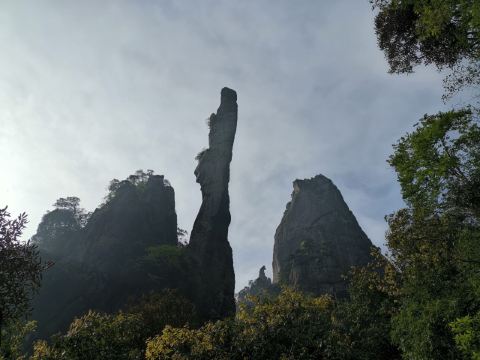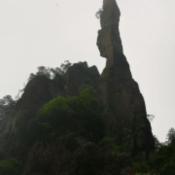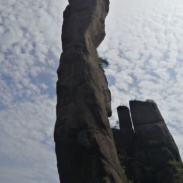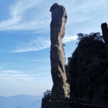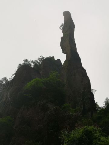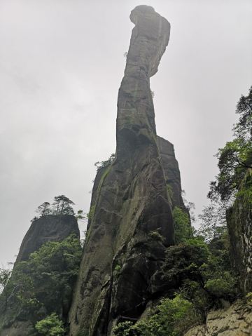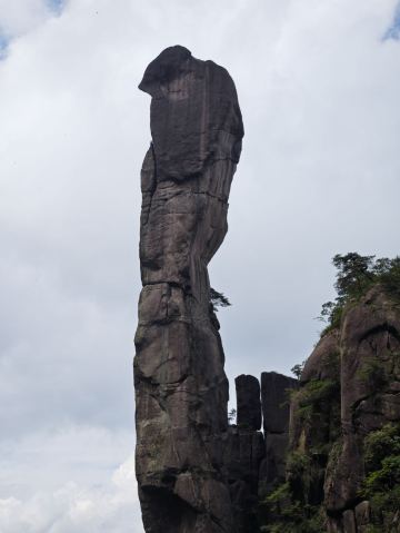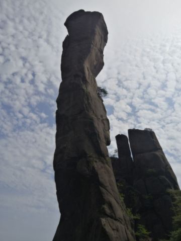 它是一根巨型花岗岩石柱,顶部扁平,颈部稍细,较细之处直径约7米,形似一条硕大的蟒蛇破山而出,如今经过亿万年的风雨依然屹立不倒,很是奇特。
