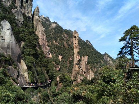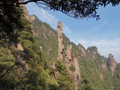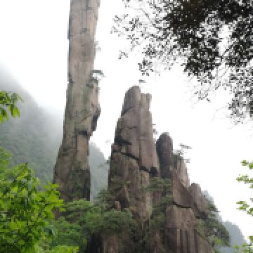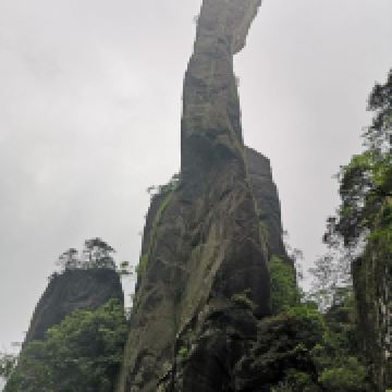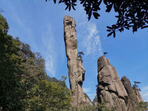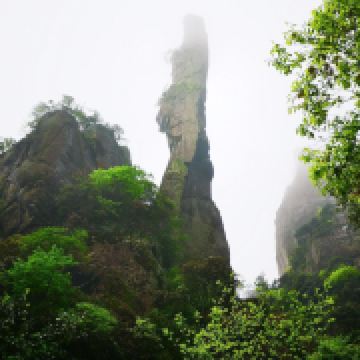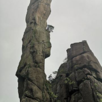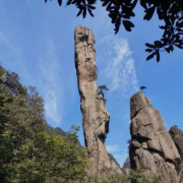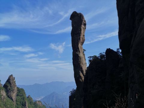 巨蟒出山是三清山“三大绝景”之一,位于南清园北部玉皇岭深谷,海拔约1200米,垂直高度达128米,相当于42层楼。其主体为巨型花岗岩石柱,经亿万年风化与重力崩解作用形成,顶部扁平、颈部纤细(最窄处仅7米),形似巨蟒破山而出,直欲腾空。这一奇观被世界纪录认证机构(WRCA)评为“世界最高的天然蟒峰”,是花岗岩峰林地貌的典型代表,具有世界级地质研究价值。