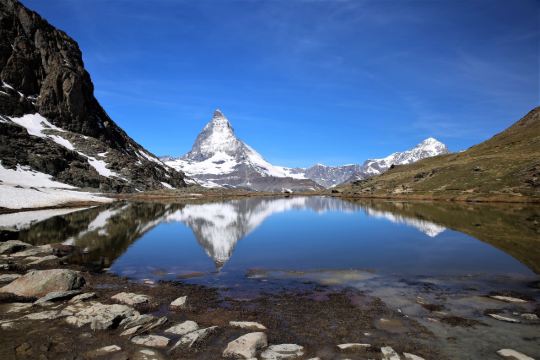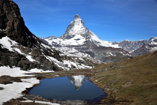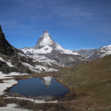 乘坐火车到倒数第二站Rotenboden观景点下车,在车站附近的山坡上能够远远地眺望马特洪峰和山峰前面的一洼池水。