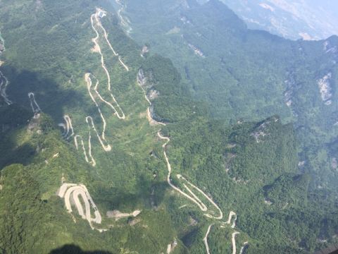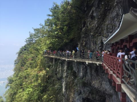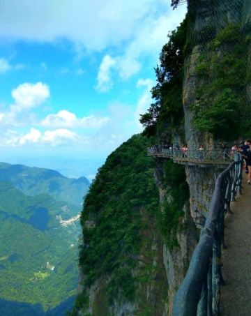 这条栈道既不在悬崖之巅,也不在悬崖之侧,而是全线都立于万丈悬崖的中间,而其中尤其惊险刺激的一段则是“天空之路”。这段长60米,宽1.6米的玻璃栈道悬空在海拔1400米以上的山崖间,非常透明,低头就能看见倒映在脚下的天空和白云,让人心跳加速。