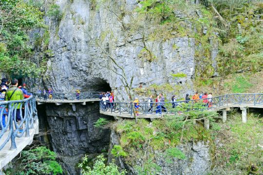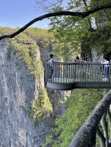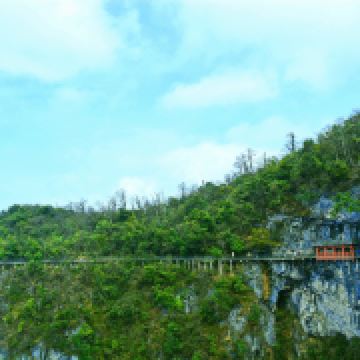 站在栈道之上,脚下是成群的飞鸟,眼前是辽阔的山野,成群的小鸟在峡谷中嬉戏。距栈道终点不远处,还有一个凌空伸出的长约5米的玻璃站台,这种非比寻常赏景的方式真不是一般人能“享受”到的。另外在栈道的完结处的两个悬崖之间有一条长160米的悬索吊桥,刺激一重接着一重,想不尖叫都难。