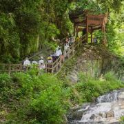 微信小程序阁皂山风景名胜区由阁皂山、玉华山、昭明山、梦湖度假区等景区组成,方圆二百余里,以其山川之秀、宫观之丽、古迹之异、峰岩之奇、传说之神成为闻名遐迩的旅游胜地。阁皂山风景名胜区不仅曾以道医著世,而且其山川风光,胜景天成,由骆驼、太极、玉女、凌云、丁仙诸峰环抱,中为腹地,诸峰高多为海拔500公尺左右,唯凌云峰海拔802.7公尺。阁皂山风景名胜区已开发的景点有:接仙桥、山门、一天门、瀑布泉、鸣水桥、大万寿崇真宫、紫阳书院、石门石、风门、丹井、照门松、引路松等。天官赐福,天官名为上元一品赐福天官,紫微大帝,隶属玉清境。天官由青黄白三气结成,总主诸天帝王。每逢正月十五日,即下人间,校定人之罪福,故称天官赐福。正月十五为神诞日!斋醮三师殿,供奉陆修静(刘宋)、杜光庭(唐)、张万福(唐),此三位真人对灵宝斋醮科仪的整理和完善做出杰出贡献,故供奉于此。两侧耳房左为神虎堂,右为诵经堂。两侧配殿及耳房都是为灵宝斋醮科仪所设立的。太极八卦是中国古代道家论述万物变化的重要八种图形,分别为乾、坤、震、巽、坎、离、艮、兑。象征天、地、雷、风、火、山、泽、水八种自然现象,以推测自然和社会的变化。在大万寿崇真宫前百米处,以太极八卦为原形,周边种植了许多材料药树,修建成了一个类似迷宫,供游人祈福、遐想、休闲、休养、体验、玩耍、娱乐的场地。观音堂为阁皂山老“崇真观”,里面供奉着观世音菩萨,大家在这里朝拜,祈福保平安。“阁皂天下灵,福地世上稀”,阁皂山风景名胜区向来以药灵、道灵、山水空灵著称,也祈愿观音菩萨给今天上山的游客朋友们带来健康和好运。紫阳书院原是古代全国有名的知名品牌大学,原名为“道德宫”,也是名人论道讲学、唱和燕憩的场所。南宋理学家、思想家、哲学家、教育家、诗人朱熹,为了广传真理和思想,两次在这里讲学,因其别号紫阳,故时人又称其为“紫阳书院”。现庭院门额上“紫阳书院”四个苍劲的枯笔字,是朱熹手书的拓刻。进门左边的这棵银杏树,是当年朱熹为创杏坛气氛,而精心栽种的。
