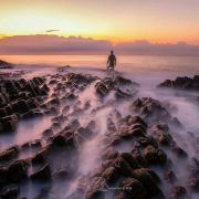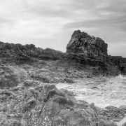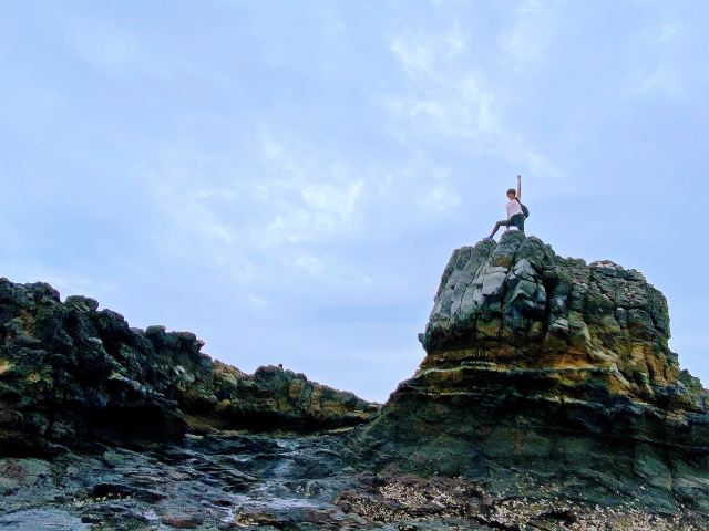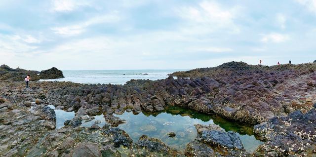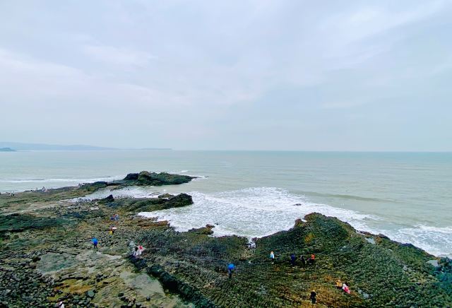 出行前一定好看好退潮时间,退潮了才能看到火山口。我们是农历廿二,11:30的退潮时段,9:30达售票处,一路玩海很轻松,沙滩有些镜面效果,薄薄的一层海水不用脱鞋不湿脚的玩沙子。一路散落了大大小小的黝黑的火山石,坐在古火山口上感受着大自然的鬼斧神工,层层叠叠的火山岩石是以前从未见过的。摆拍够了之后沿着旁边的栈道往上可以看到整体的火山构造,还是要掐着时间,退潮快涨潮也快,我们磨蹭着,看全景时还是被海水淹掉了点