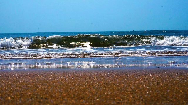 海滩上有很多孩子,有些孩子在玩水,有些孩子在游泳,玩得可开心啦!有些孩子在冲浪.一束束浪花冲耍小脚丫上真舒服呀!还有些人在捡贝壳,他们捡了红的,白的,紫的......五光十色,美丽极了!还有些孩子在堆沙子,有的在堆房子,有的堆城堡,还有的堆山洞.还有些人躺在沙子上呼噜呼噜地睡大觉,真在进入梦乡.