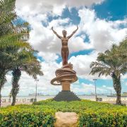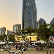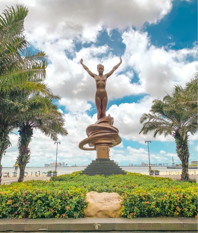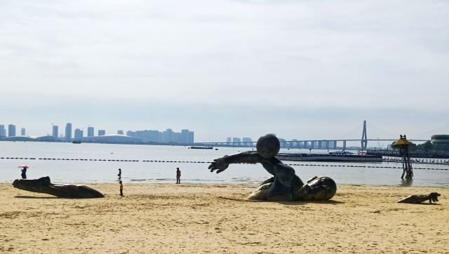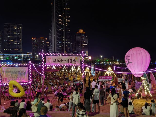 湛江市金沙湾滨海休闲旅游区位于广东省湛江市赤坎区的东海岸,是国家级4A景区。该旅游区自西向东分为多个功能区,包括水上运动中心、人文景观展示区、沙滩亲水活动区等。区内设有多座雕塑,如以劳丽诗为原型的《奥运女神》雕塑,以及其他以水球和花样游泳为题材的作品。此外,还有20名湛江籍世界和国内冠军运动员的手印石刻。游客可以免费使用海水浴、沙滩椅和太阳伞等设施。金沙湾总面积约20万平方米,绵延2.65公里,游客可以眺望湛江奥体中心和湛江海湾大桥。这里经常举办各类节庆活动,如国家风筝精英赛、沙滩音乐节和啤酒节等,是2016湛江海洋周的主会场。金沙湾于2012年开放,是一个将海岸景观与城市生活结合的综合性风景区,提供丰富的休闲和文化体验。
