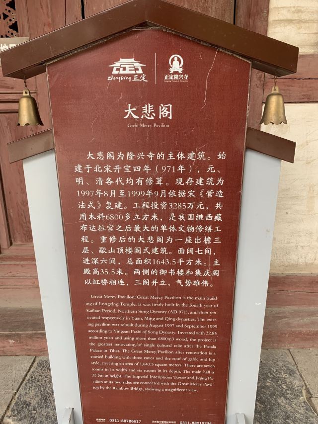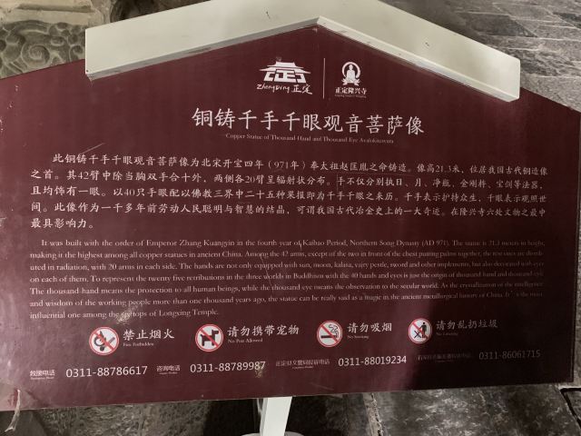 正定府大菩萨在定城内隆兴寺的大悲阁中为千手千眼观音菩萨像,高22.28米,42臂分别执日、月、净瓶、宝杖、宝镜、金刚杵等法器。面部表情端祥恬静,仁慈庄重。达到了瞻之弥高、仰之益恭的艺术效果。