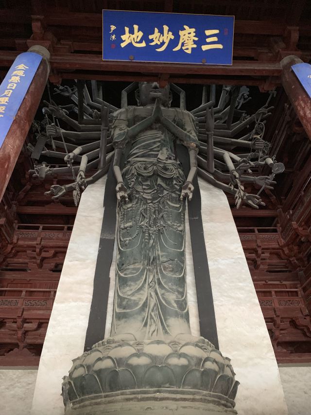 据寺内一通宋碑记载,这尊菩萨像的铸造程序十分复杂:先铸好基础,然后分七节铸造大菩萨。第一节铸下部莲花座,第二节铸至膝盖,第三节铸至脐下,第四节铸至胸部,第五节铸至腋下,第六节铸至肩膊,第七节铸至头部。最后添铸四十二臂。菩萨的手均为木雕而成,其上裹布,一重漆,一重布,然后用金箔贴成。
