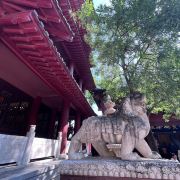 寺院是典型的唐式回廊建筑,五进院落层层递进,朱红立柱搭配深远出檐,屋顶的鸱吻与脊兽透着古朴庄严的美感。最震撼的当属观音阁里19米高的室内观音像,整块花岗岩雕刻而成,面容慈祥又威严,仰视时满心都是敬畏。沿途随处可见精美的石像,从石狮子到明清遗存雕像,仿佛逛了座露天石雕博物馆,每一处细节都值得细细品味。