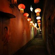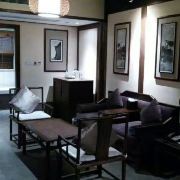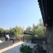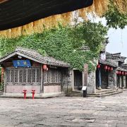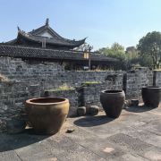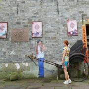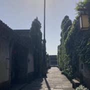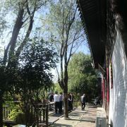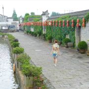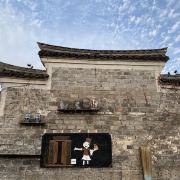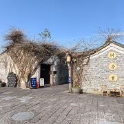 过了桥是明清街,由于被当做拍摄基地,所以依旧保留了很多当时拍摄使用的道具,有不少创意桌椅。这边的街道和宅院颇有明清韵味,天气好的时候尤其适合拍照。一些宅子被改造为餐馆和展览馆,许多出名的宅子能通过墙上的介绍牌了解它们的历史。