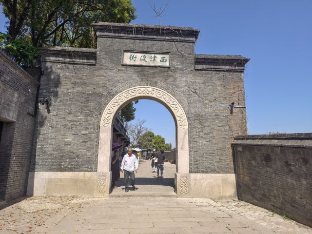 继续往西走有小山楼、待渡亭等小景点。小山楼是一座始建于唐代的小木楼,楼檐下挂有余秋雨先生题辞“金陵渡”的匾额,楼前可俯瞰街区老宅的层层青瓦;待渡亭曾是古人候船或小憩避雨的场所,传说乾隆皇帝也曾经在此亭中停留过。过了待渡亭则看到两边开满各色商铺,茶馆、工艺品店、面馆样样都有,挂满了各种有趣的店招,颇显小资气息。如果嘴馋了,可以尝尝状元饼、臭豆腐等小吃,价格不贵。