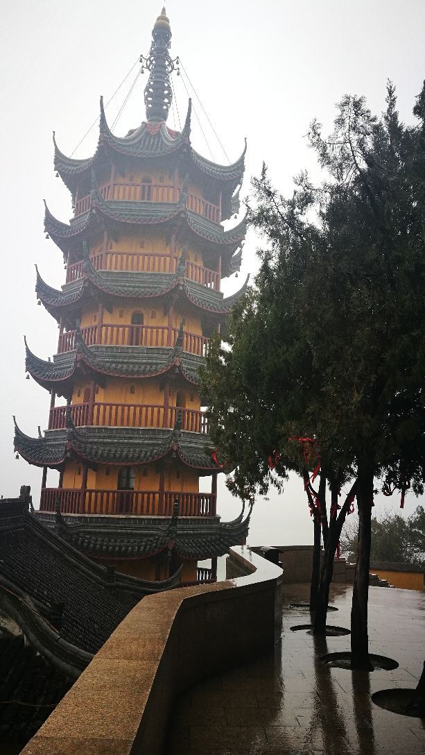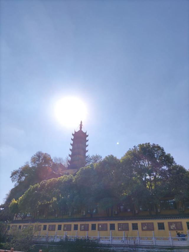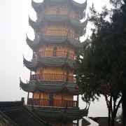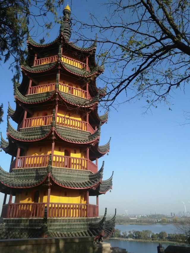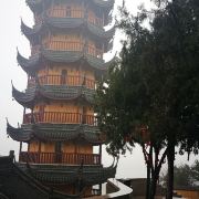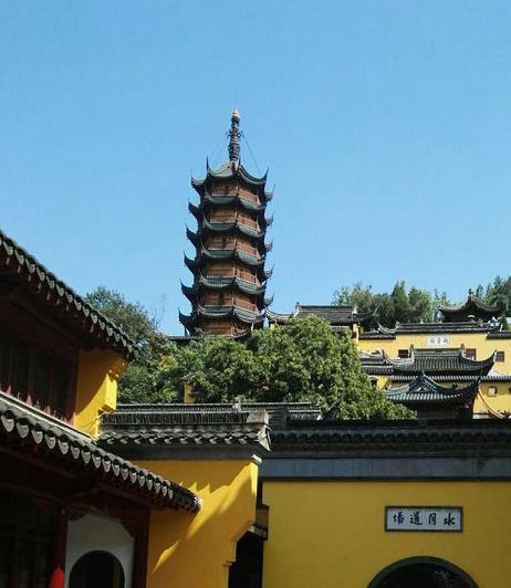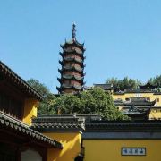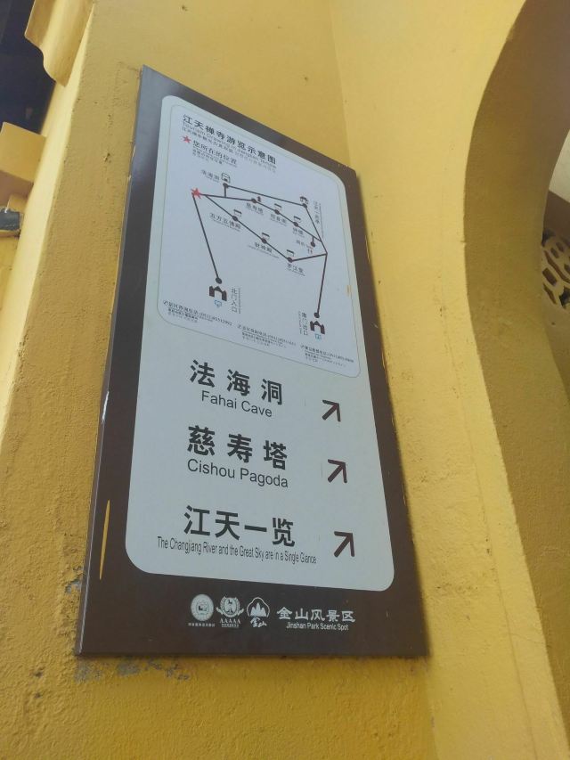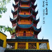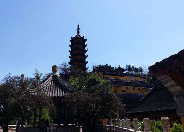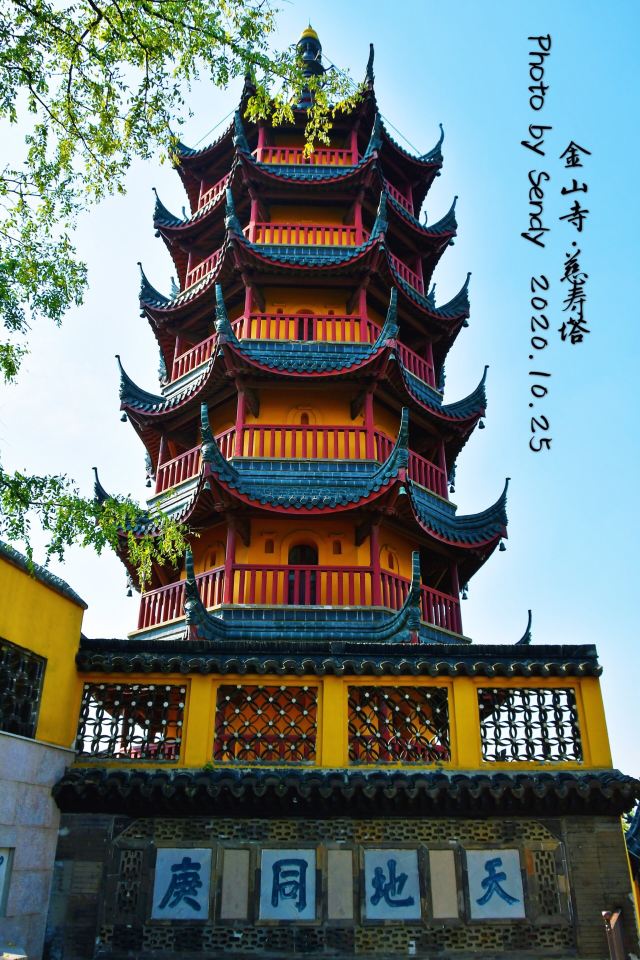 慈寿塔位于山顶,是金山标志。高约三十六米,砖木结构,七级八面。顺着内部旋式木梯可直登塔顶。俯身栏杆,镇江城尽收眼底,可见大江浩荡东去,群山逶迤入怀之雄伟气势。慈寿塔下,有金山寺镇山之宝-周鼎、金山图、铜鼓、玉带,合为“四宝”。