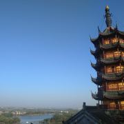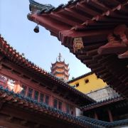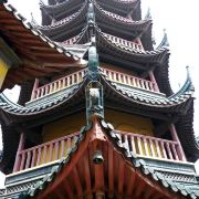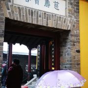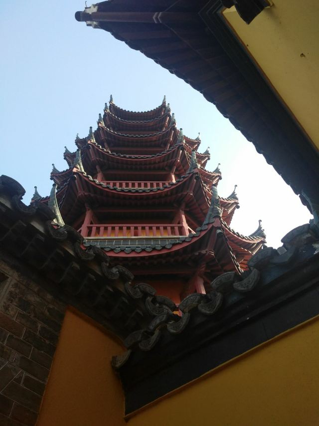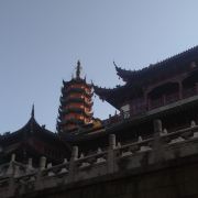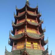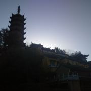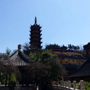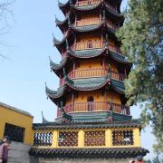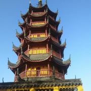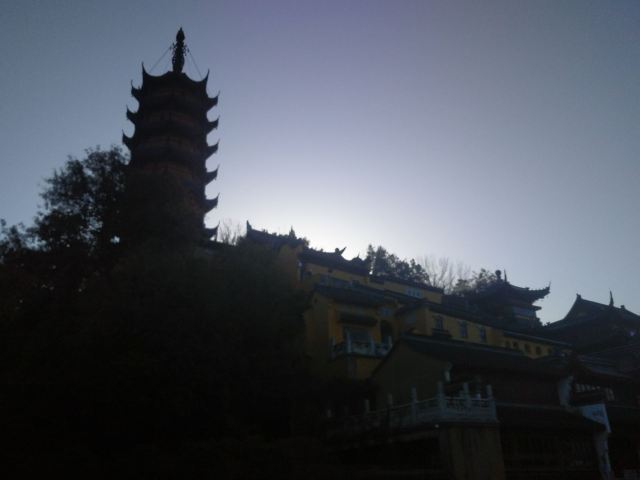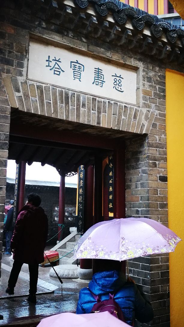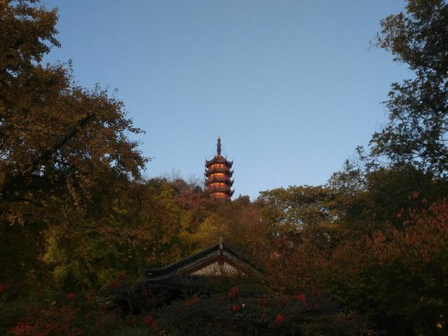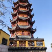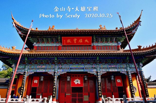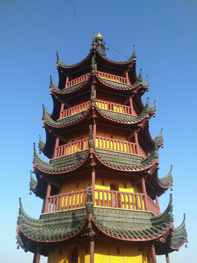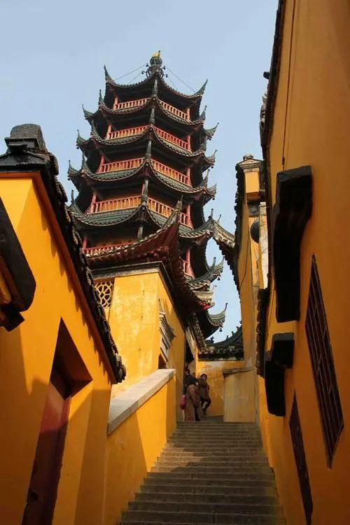 慈寿塔位于山顶,是金山标志。高约三十六米,砖木结构,七级八面。顺着内部旋式木梯可直登塔顶。俯身栏杆,镇江城尽收眼底,可见大江浩荡东去,群山逶迤入怀之雄伟气势。慈寿塔下,有金山寺镇山之宝-周鼎、金山图、铜鼓、玉带,合为“四宝”。