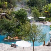 荷花温泉充分利用得天独厚的温泉资源和自然生态田园风光,精心设计,建成集度假休闲、观光游览、展销购物、餐饮住宿、会务接待、商贸洽谈、文化交流为一体的综合服务区和旅游景区,为顾客提供各种服务。荷花温泉亨有“温泉博物馆”之美誉,景区内已探明拥有25处天然温泉出水口,有小苏打泉(可直饮温泉)、硅酸泉、硫磺泉、铁泉、氯化钠泉、碳酸泉6种泉质。森林温泉泡池温度在38℃-45℃之间,森林覆盖率高达95%,19个特色泡池掩映在原始森林中(19个特色泡池包括玫瑰、牛奶、芦芸、薰衣草、艾草精油泡池,漩涡池、泡泡池等功能性泡池及原汤池),配套水华茶餐厅、干蒸房、湿蒸房等。
