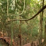 千米国画长廊,因为远远望去酷似一幅浓黑重彩的中国山水国画,因此得名。壁画陡立成崖,崖面有的形成崖厦,有的参差不齐,蜂窝状溶孔密布,有的如刀削斧劈般平整光滑,有的像一台台的梯田,崖面由于杂质浸染及附生攀援植物的点缀变得色彩斑斓,如同一幅巨型壁画,描绘了古老大地的沧桑。