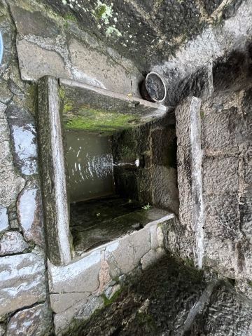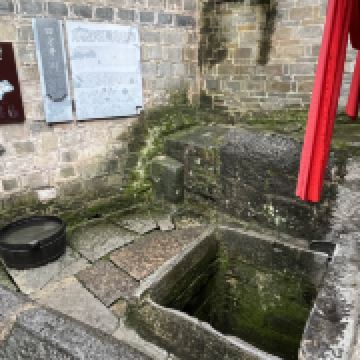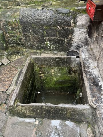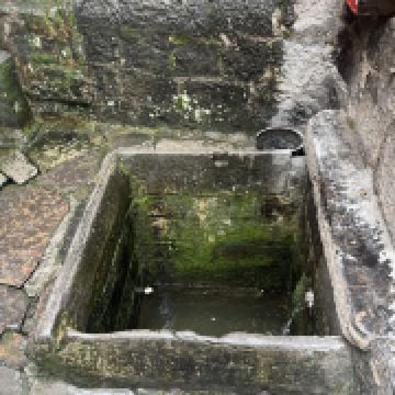 四方井呈四方形而得名。井口用細鏨長條青石鑲砌,邊長1.2米。井壁和井底用細鏨大塊青石鑲砌,形成井口、井底同樣大小的正方形。井深2.2米。北面離井口0.6米處有一石穴,泉水流入井中。水質極佳。井臺地面以及井的東、西、北三面的墻均用細鑿青石鋪砌和築墻,墙高1米。東南方向1.5米出口,出口與四方井巷相接。井北面有高出井口1.5米的磚砌小廟,井臺總占地7.1平方米。年代久遠,井壁、井臺、圍墻青石磨得光潔圓滑。清乾隆《鎮遠府志•山川》載:“四方井,在府治西,源出石屏山”。四方井建成後,很少進行維修,是巷内居民生活的主要用水。