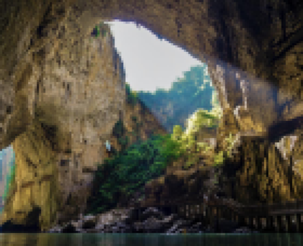 灯光映照下,钟乳石闪烁着晶莹的光芒,仿佛镶嵌了无数宝石。沿着蜿蜒的栈道前行,脚下是深邃的地下河,潺潺流水声在洞内回响,更添几分神秘。洞壁上,石笋从地面拔地而起,与钟乳石遥相呼应,宛如一座座天然的雕塑。