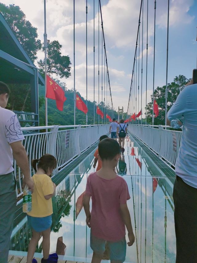 玻璃桥长228米,仿佛是在空中架起的一座“天桥”,桥面透光率高达到99%,40多层楼的高度给人超棒的悬空体验,肾上腺马上飙升!桥面更有5D声光电特效装置,模拟“碎裂”的逼真效果让游客身临其境感受刺激体验。四周群山环绕,站在玻璃桥向下望去,远处的风景尽收眼底,犹如雄鹰矗立山峰,俯瞰大地!是2021年打卡必到之处哦!
