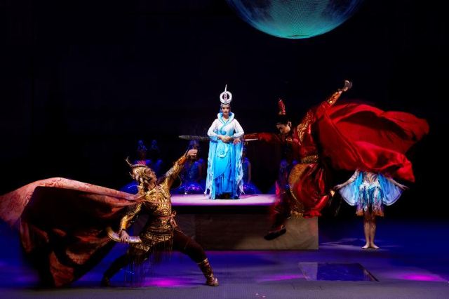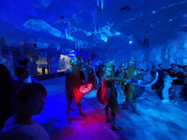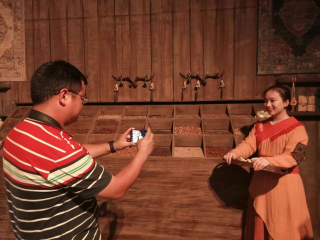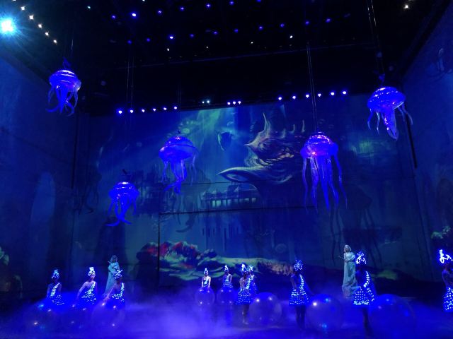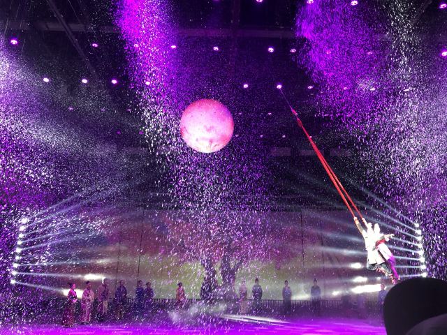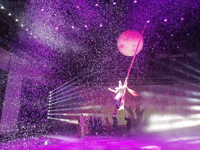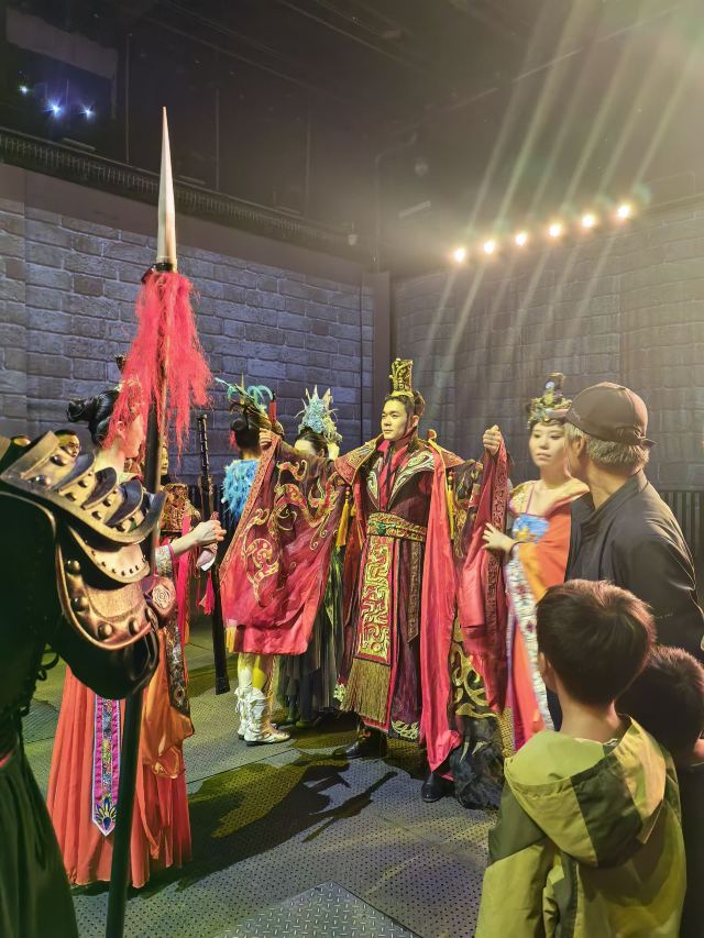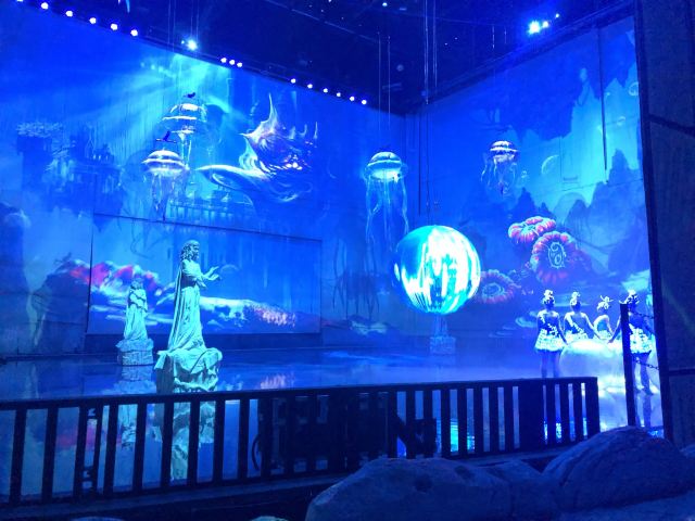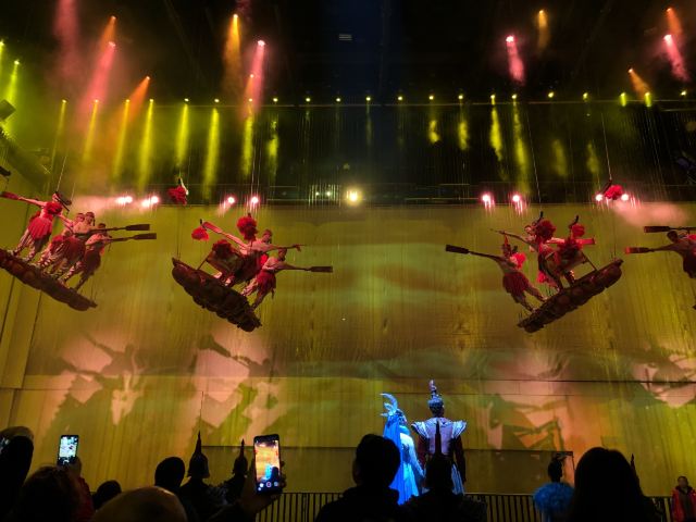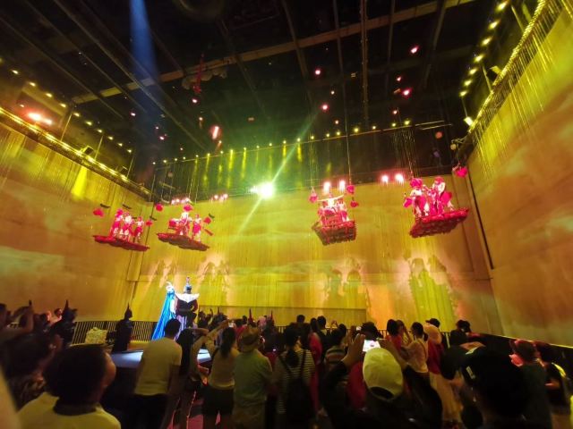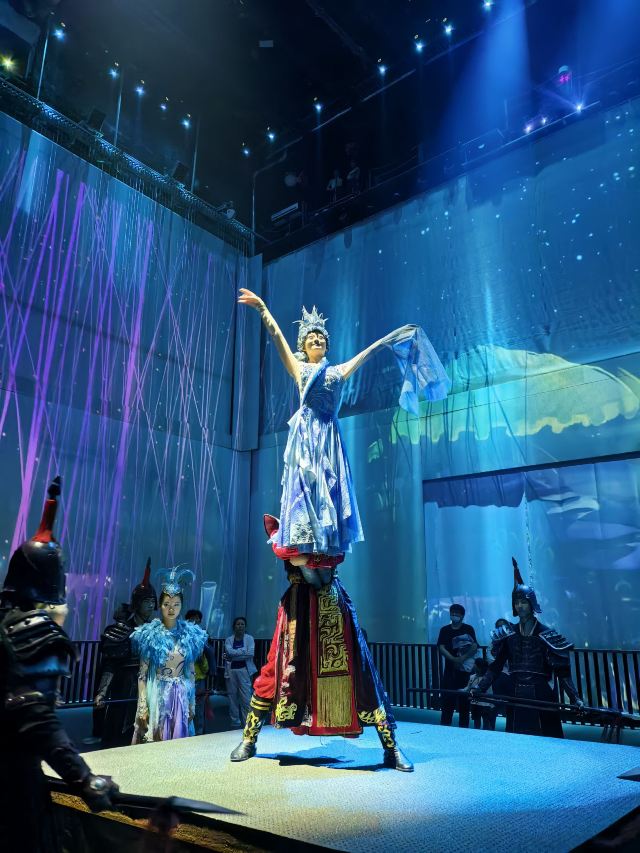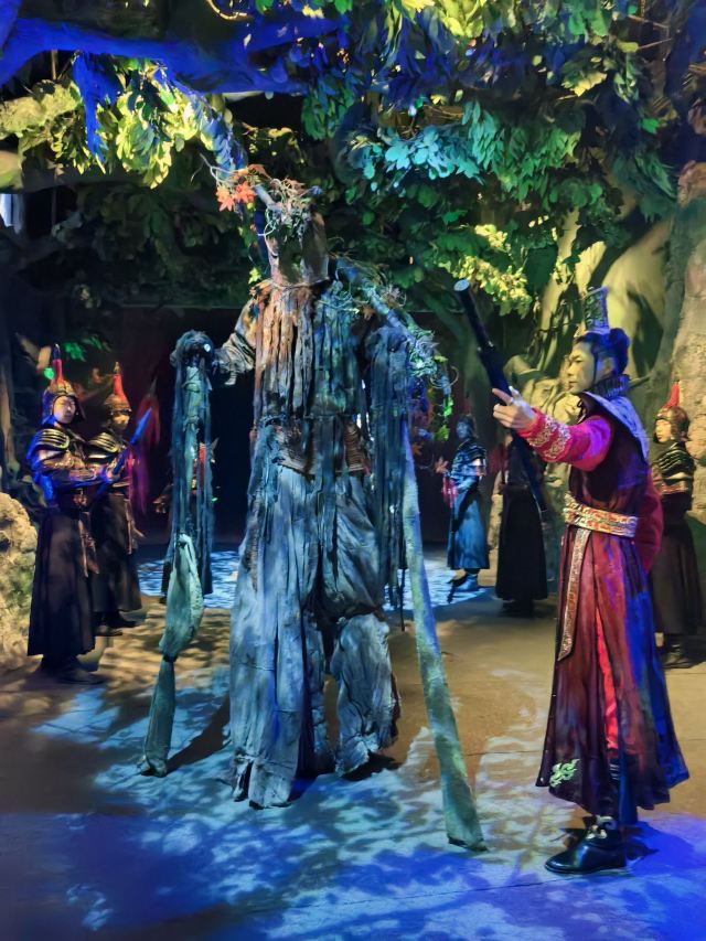 与传统观演模式不同的是,《沙坡头盛典》集成运用了声、光、影、水、雾、烟以及全息影像、玻璃晶球、巨型升降平台等技术手段,让观众在演员的带领下,跟随剧情的发展变化行走在森林、火山、冰川等不同的演出场景中。演出过程中,观众不仅可以“触摸”到剧中的物体,还能随剧情变化,感受到桂王国的鸟语花香、魔幻森林的飞禽走兽、炼狱熔岩的火红炽热、冰雪世界的纯净寒冷,同时品尝到宁夏枸杞和当地美酒。