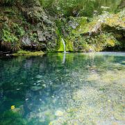 迎面遇见的两个大小天池,一上一下,相隔不远,却都清澈见底,如翡翠又如牛乳般的澄碧蓝色,在绿树巨石的拥抱掩映下,自成一方天地。