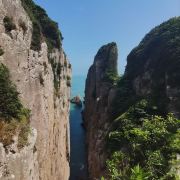 弹指峰状如拇指从掌中弹出,如宝剑倒插在海边,坐落在“鬼斧觖”的地方,孤峰矗立、刀削斧劈、悬崖绝壁、凉风习习。弹指峰也是金庸名著《射雕英雄传》书中描述的黄药师练成绝技之地。