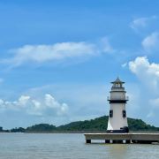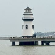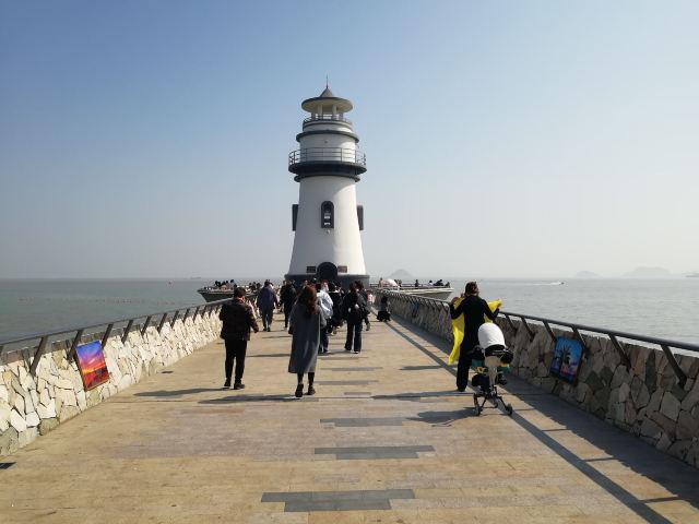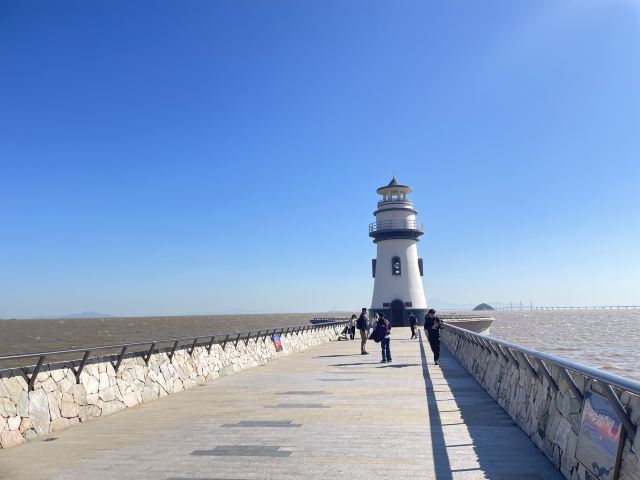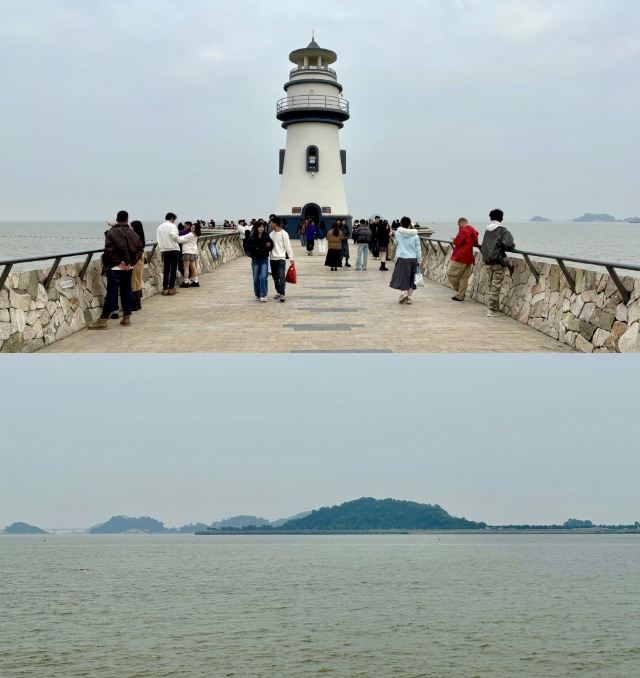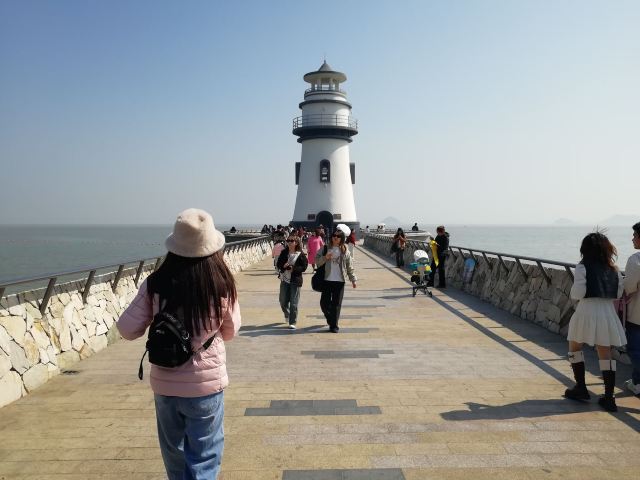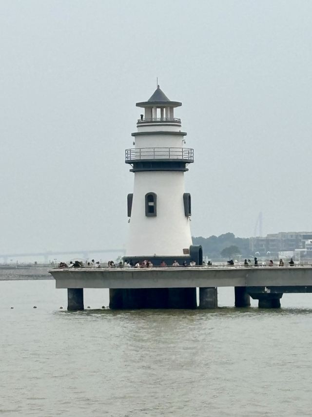 对面延伸出去的长堤顶端,有一座大大的灯塔,黑白相间,极其出片。