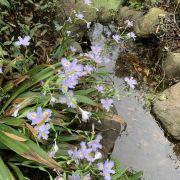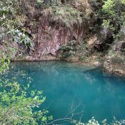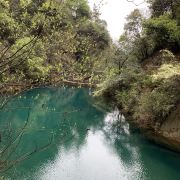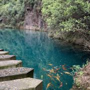 沿步道往上走,一路都有小溪水、小瀑布相伴。过小水库边缘曲折有趣的石板路,再摇摇晃晃走过悬索桥,一段柳暗花明之后到达山顶的天池。这里的潭水清得几乎能见底,水面尽是绿树的倒影,有几分九寨沟的姿色。再往里走,上山步道的尽头是最后一条瀑布,由此返回,不远便是通往知青渠的岔道。知青渠走到底有个滑道(林中飞鼠),图方便的游客可以坐滑道下山(50元左右),走下来大概十多分钟。