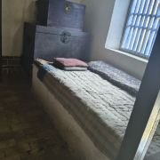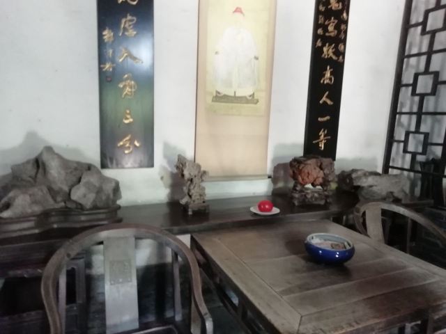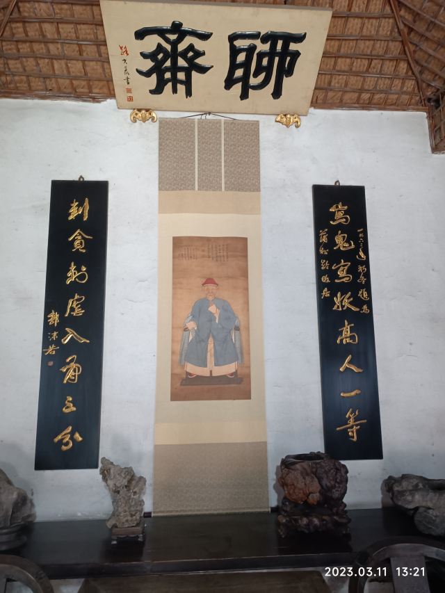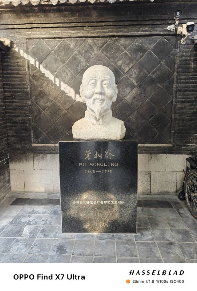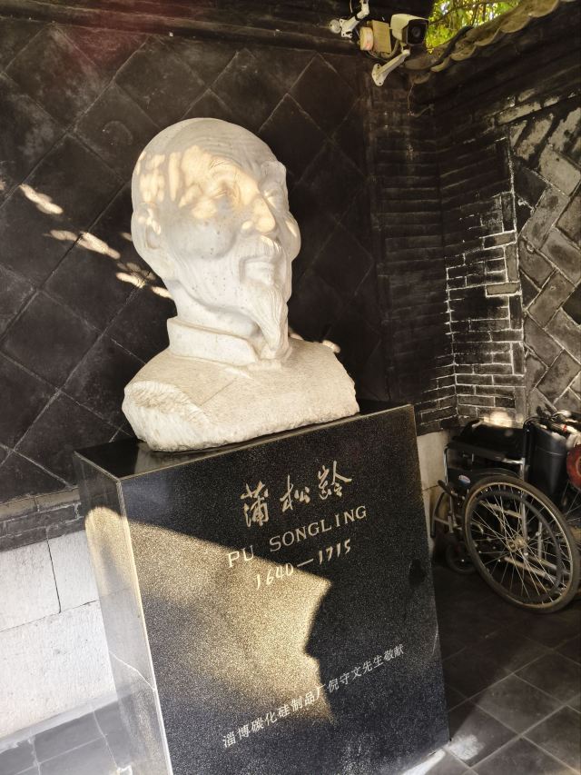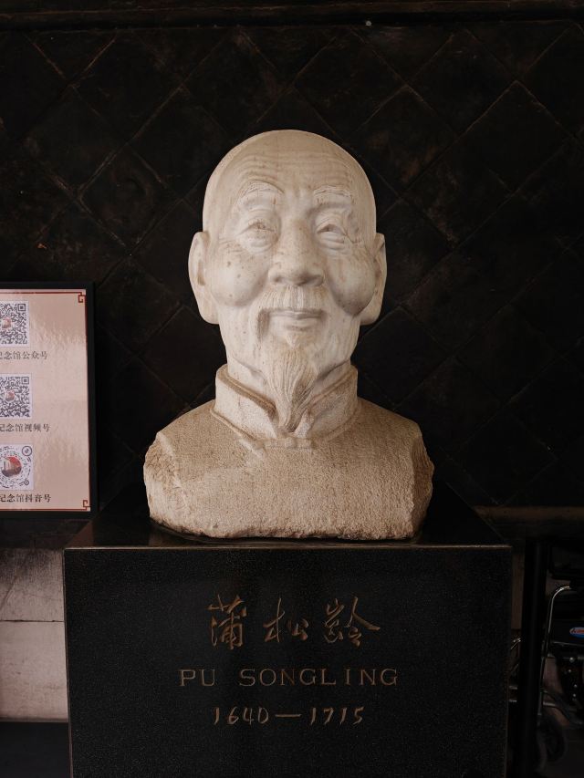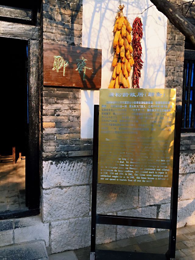 蒲松龄故居院落坐北朝南,前后四进,西有侧院,院内月门花墙,错落有致,山石水池,相映成趣。北院的三间正房就是“聊斋”。正房的东西方向各有两间厢房,是典型的北方农家建筑。蒲松龄故居在蒲松龄去世后一直由他的后人居住,后因故被毁,房主出走东北辽宁,这是五十年代重新修复的。走进正房内,您可以看到蒲松龄的画像。画像两旁悬挂的是对联“写鬼写妖高人一等,刺贪刺虐入骨三分”。西面则是蒲松龄先生的会客室,这里有他当年用过的坐榻,客室中间摆放的小矮桌,可以盘腿而坐。南窗下还有先生用过的书桌、砚台,它们看上去简朴而平凡,却仿佛能告诉我们先生满腹才华和怀才不遇,以及他的落魄与执着。东侧是蒲先生的卧室,1715年正月二十二,蒲翁就在这个炕上“倚窗危坐而卒”,炕头上摆放着一盏锡台灯,是蒲翁墓里出土的。