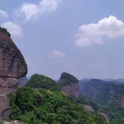 资源新宁红层盆地的主峰——八角寨,为方山形地貌,海拔814米,相对高度约400米,东、西、北三面为光滑有形的悬崖绝壁,登上山顶后有一种横空出世的感觉。此外,资源丹霞地貌还有很多宏伟壮观的地质地貌景点,如天脊、龙脊、风帆石、资新大断裂遗迹等。有丰富的造形,形状象螺、大象、大佛、山羊、骆驼、猫头鹰、企鹅、风帆、蜂窝及象各种壁画图案等等,其中奇特的类型有“群螺观天”、“泪人石”、“人字天”石、“风帆石”、“神象饮水”、“山字石”、“蒋军骑马壁画”等。