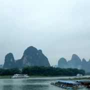 2、从桂林游船码头到阳朔的漓江段全长约60公里,单程4.5小时,单向无往返,所以要从阳朔乘车回桂林,或是自由行的话将漓江作为桂林市区的最后一站,阳朔结束后直接北上去其它县市逛。出发的码头有两个:“磨盘山码头”(三星级游船)和“竹江码头”(四星级游船)。由于桂林已经5个月没下雨,漓江已经断流成了几个大湖,所以此次没能坐游船逛遍漓江,只能在携程上找了个一日游产品坐大巴到“兴坪古镇”的“兴坪码头”附近游江,绕一圈后返回兴坪码头再坐车回桂林。