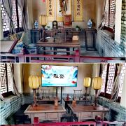3、进十笏园后右拐,映入眼帘的是园内标志性景观池塘,穿过池塘向北是主楼“砚香楼”,建于明代,清代被丁家购得后以此楼为基础扩建成现今的整个花园,此楼作为藏书用,与门外的太湖石、池塘连成一条直线,目前室内是家居布景和丁善宝蜡像。砚香楼附近的景观有: