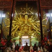 遵义湘山寺三圣殿,是善化寺的中殿,殿内中间的三尊像为“华严三圣”。山门是寺内正门,内有天王塑像四尊,这四尊佛教神明,给人以凛然不可侵犯的印象。善化寺内,还有一座五龙壁,五龙色彩艳丽,给寺内增添了活泼欢快的气氛。