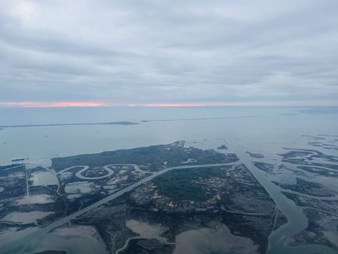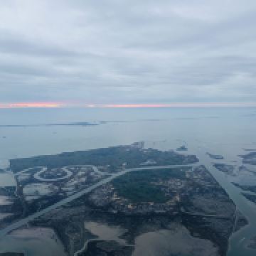 飞机降落之前,在机舱内就已经看到了弯曲的水道在阳光下闪闪发光,随即就是成片和红屋顶和鹤立鸡群的圣马可钟楼。于是,我知道威尼斯到了!