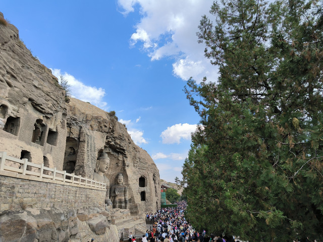 云冈石窟在距离大同市区20公里以内,但这段路简直堵成了天路历程。我们10点不到半从早餐店出发,到达云冈石窟检票处已经12点半。不到20公里的路走用了2小时。