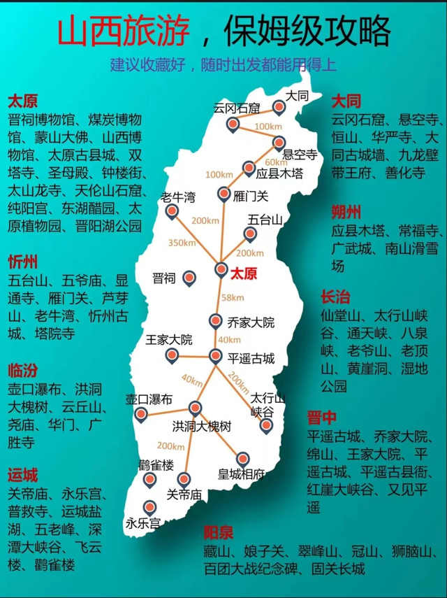 出发前我仔细研究过山西省旅游地图(见下图,侵删),虽然这并不是个旅游省份,但是本着我们二人都从未去过山西,并且有可能避免开大量旅游人群的想法选择了去晋北旅游。由于我们时间有限,此次行程中山西其他比较著名的景点如:平遥古城、乔家大院、壶口瀑布都不在考虑范围内。