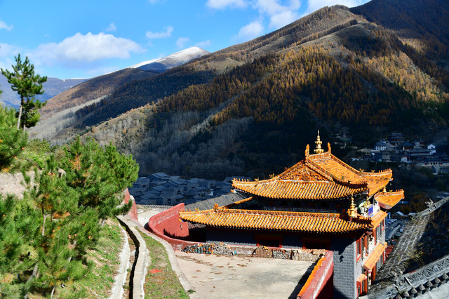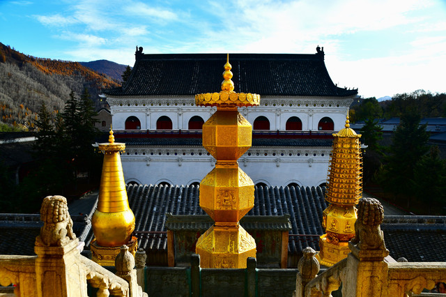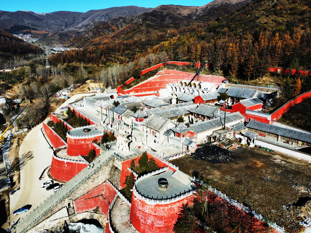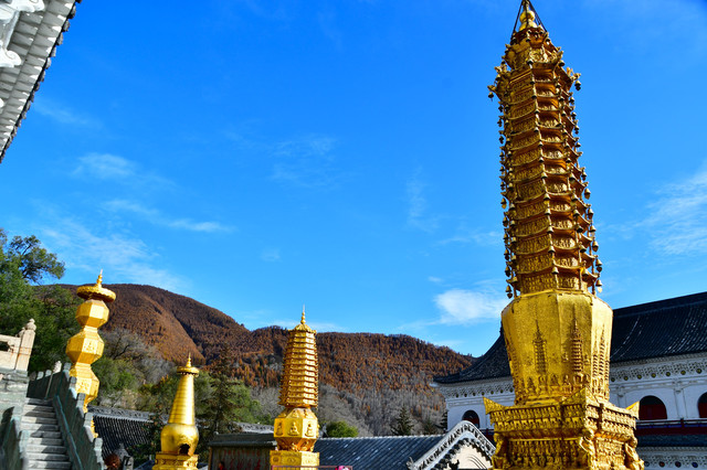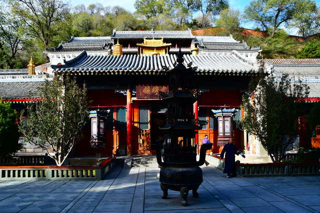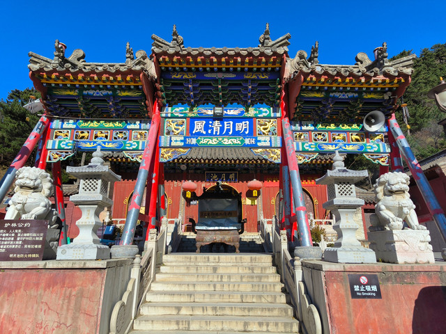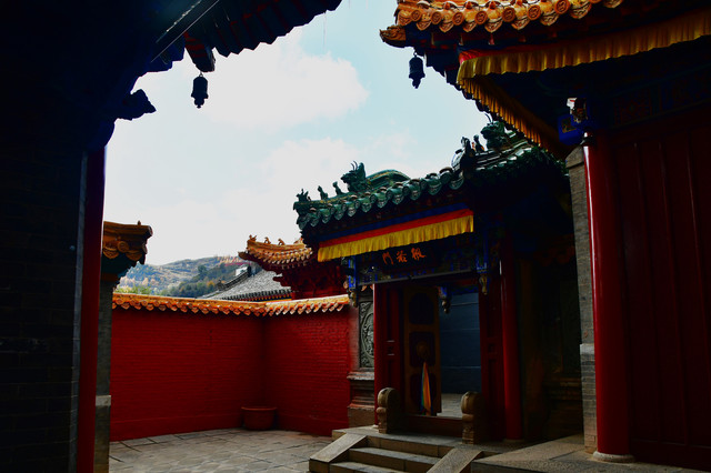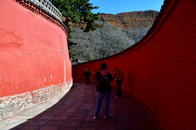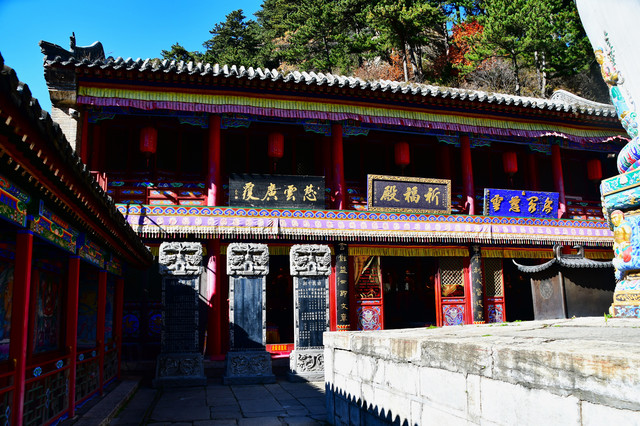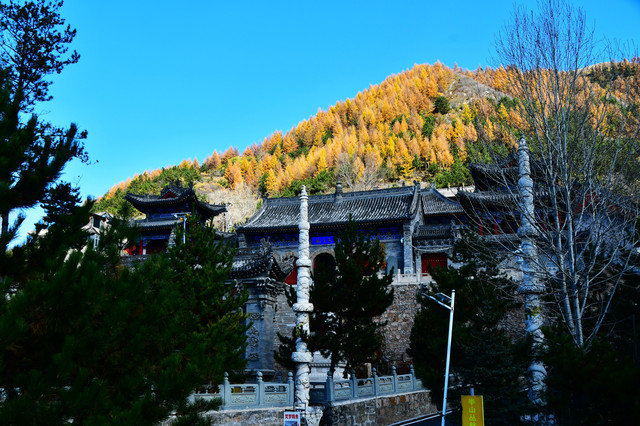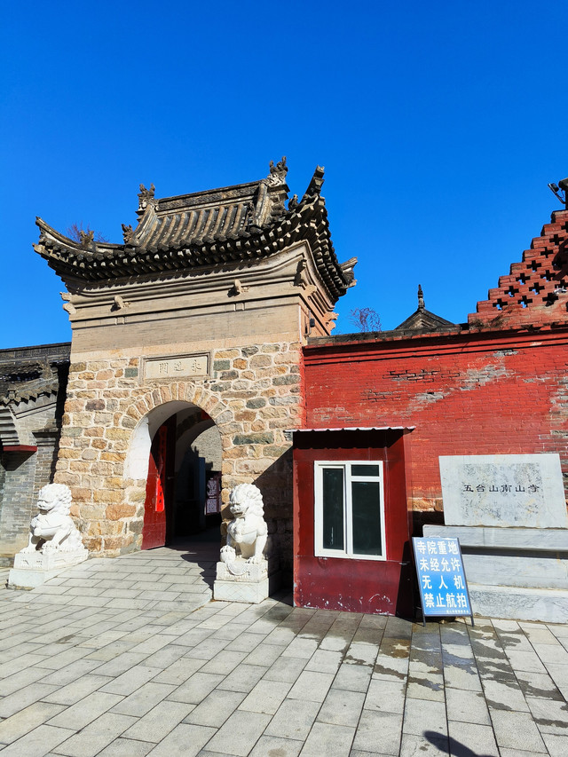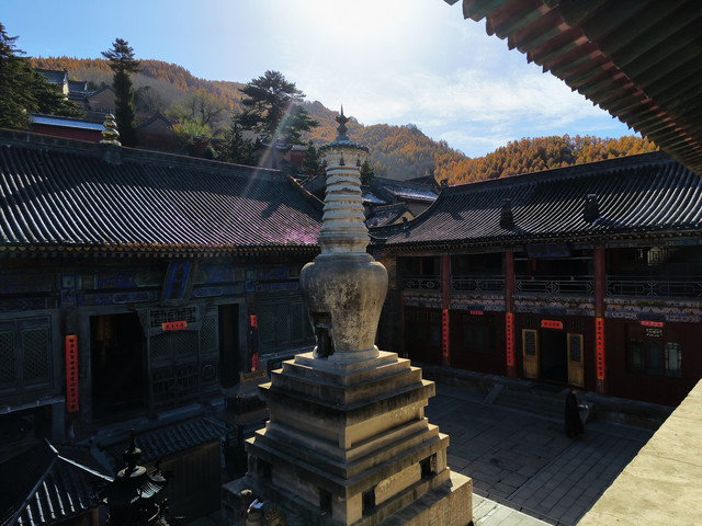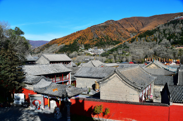 南山寺,北距台怀约2公里,依山势而建,海拔在1700米以上,共有殿堂窑房300余间,占地6公顷,规模很大,而且悬于陡峭山坡,更增添了宏伟气势。