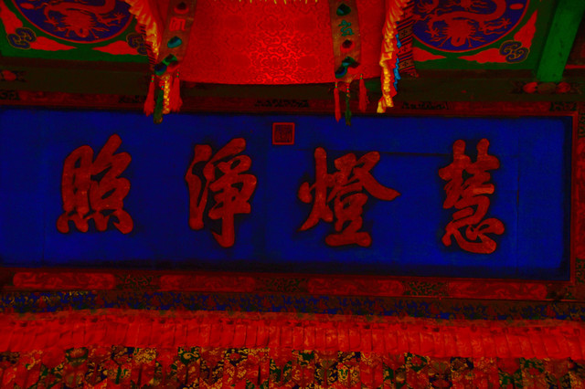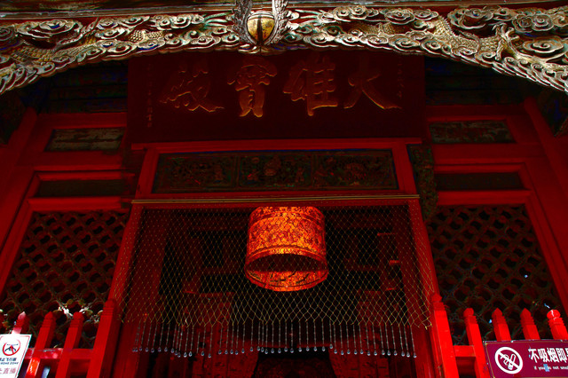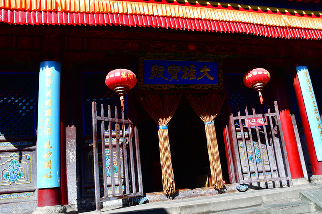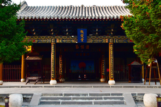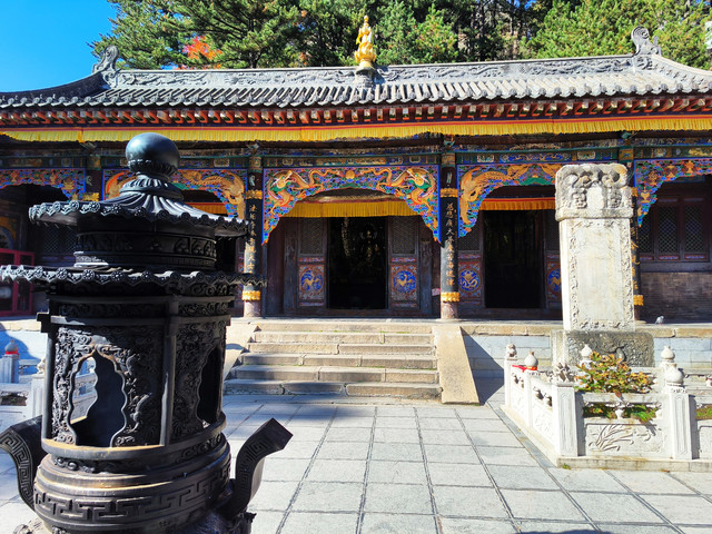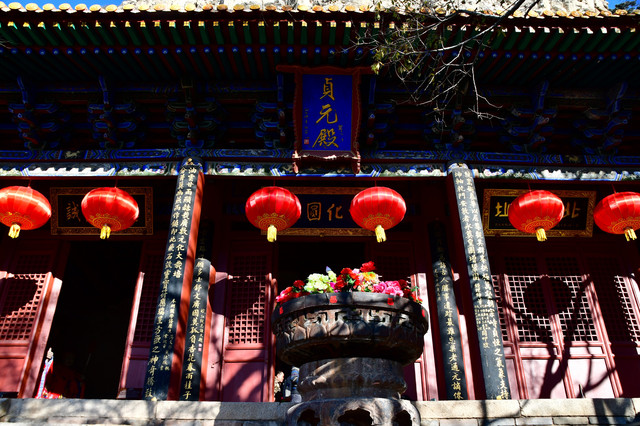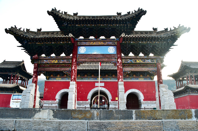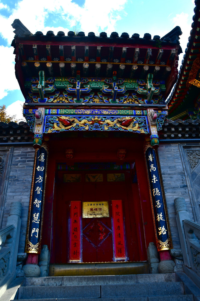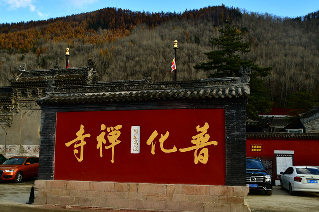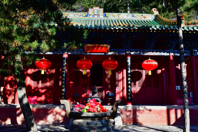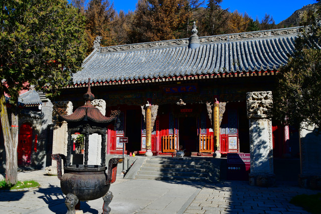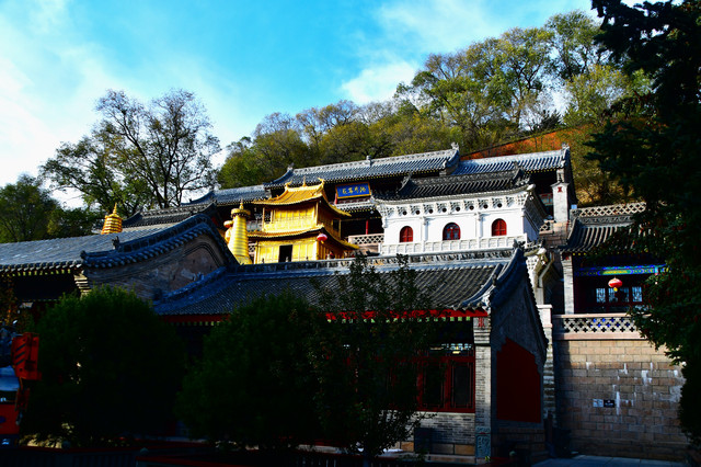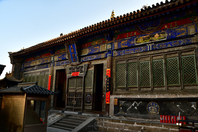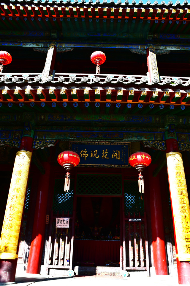 五台山普化寺,位于山西省五台山台怀镇南里许的东山脚下,背靠青山,面临清水河,环境清幽怡人。普化寺是五台山上建造较晚的一座寺院,创建于明代,原称帝释宫,清代改建为玉皇庙,供奉玉皇大帝,为五台山唯一的道宫。从民国十一年(1922年)始,大兴土木,重建庙宇,改建成了儒、佛、道合一的寺院,并且名为普化寺。寺院占地1.89万平方米,中轴线上有天王殿、大雄宝殿、三佛殿和卧佛殿四座大殿。中轴线左右各有两进跨院,整体呈凤凰展翅的格局。是一座以砖雕艺术为特色并具有园林风格的寺院。装饰精雕细刻,彩绘华贵艳丽,为民国年间的建筑风格,又具有鲜明的道教色彩。(免门票)