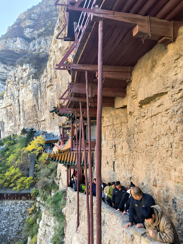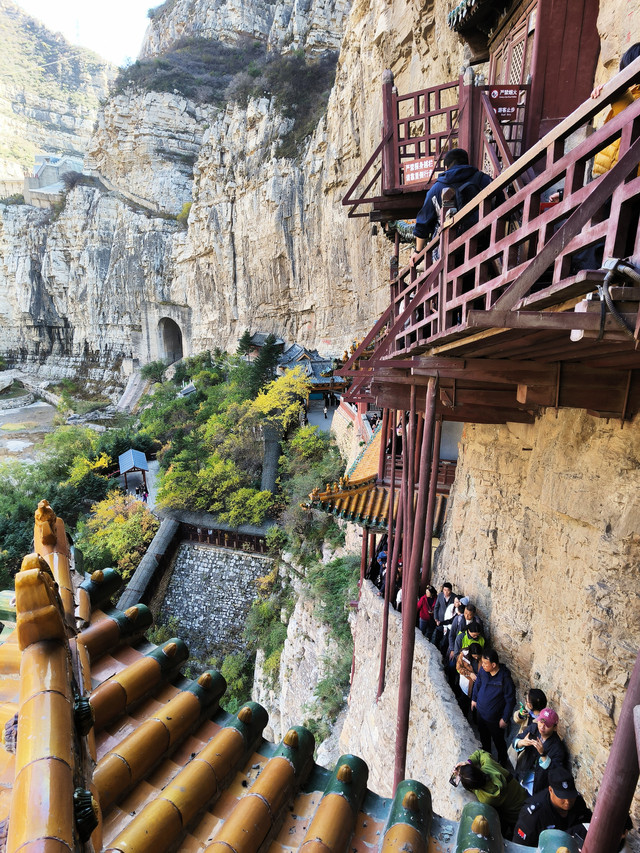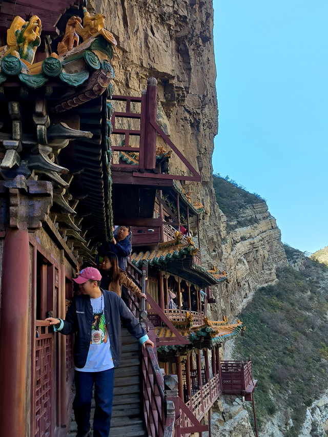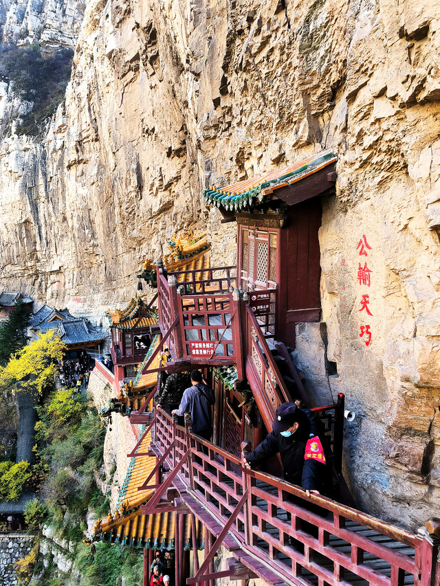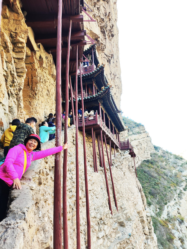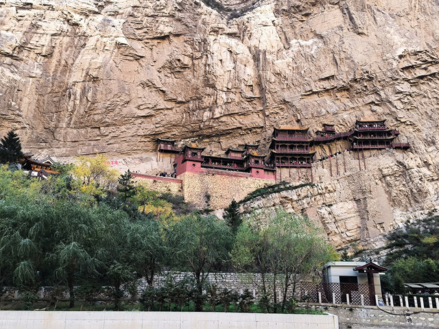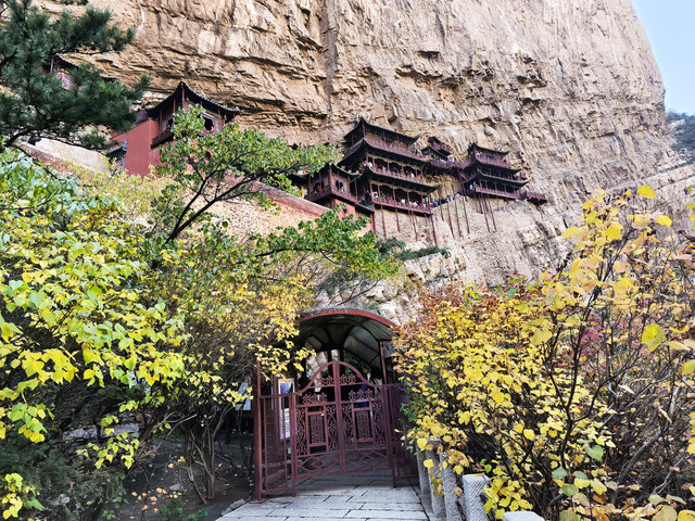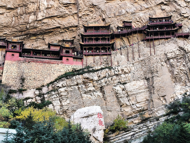 悬空寺是国内现存的唯一的佛、道、儒三教合一的独特寺庙。它修建在恒山金龙峡西侧翠屏峰的悬崖峭壁间,面朝恒山、背倚翠屏、上载危岩、下临深谷、楼阁悬空、结构巧奇。悬空寺共有殿阁四十间,利用力学原理半插飞梁为基,巧借岩石暗托,梁柱上下一体,廊栏左右相连,曲折出奇,虚实相生。寺内有铜、铁、石、泥佛像八十多尊,寺下岩石上“壮观”二字,是唐代诗仙李白的墨宝。古人云:“蜃楼疑海上,鸟道没 云中。”明代大旅行家徐霞客叹其为“天下巨观”。