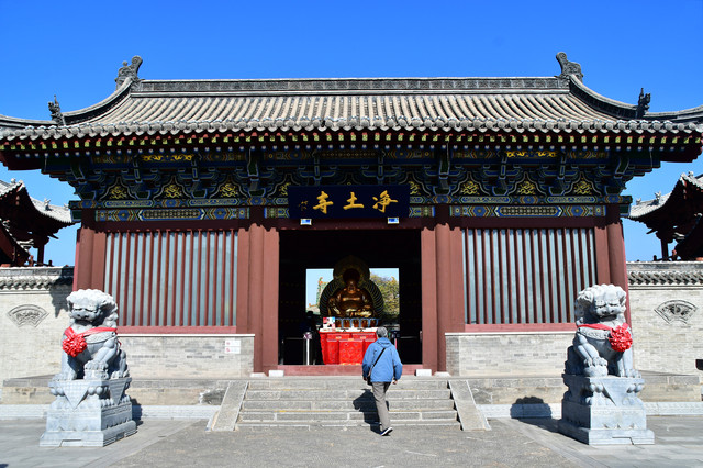 净土寺主殿大雄宝殿,始建于金天会二年(公元1124年)重建于大定二十四年(1184年),深广各三间,平面略成方形,单檐歇山顶,屋顶平缓,斗拱疏朗,侧角升起显著,虽经历代修葺,仍保持原貌。殿内有清代壁画,内容为佛教故事等,构图和技法具民间传统画风。殿内藻井及天官楼阁造型美观,构思繁复,结构玲珑。为金代精致的建筑模型和工艺美术品,是研究金代建筑规制和造型的实物资料。 (门票15元,60岁以上免票)