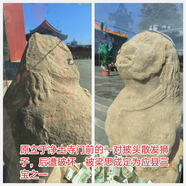 梁思成先生对上图的石狮称赞不已:“应县三宝”之一。一对“披头散发”的石狮,造型独特,雕工精美,毛发向后顺梳,反映了当时多元化文化的融合与互动,全国罕见。石狮体高0.96米,为辽代遗物,原来立在净土寺山门前,后期遭到毁坏。