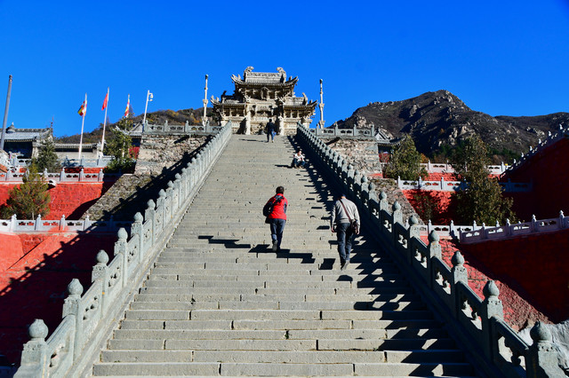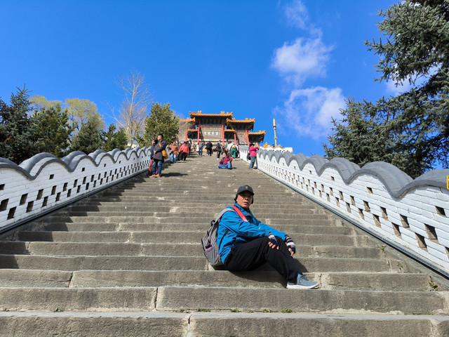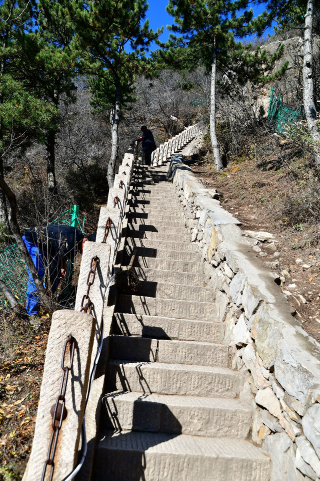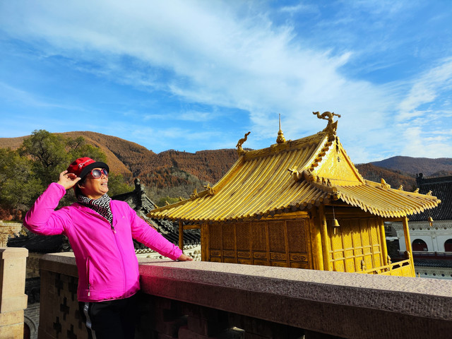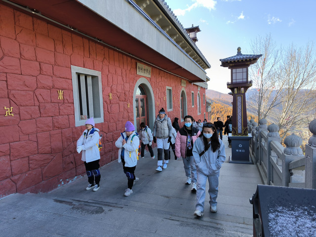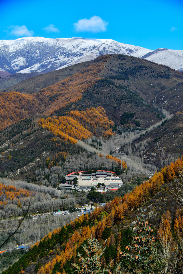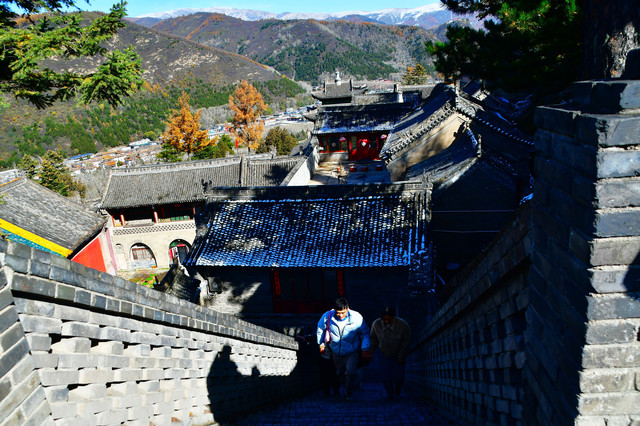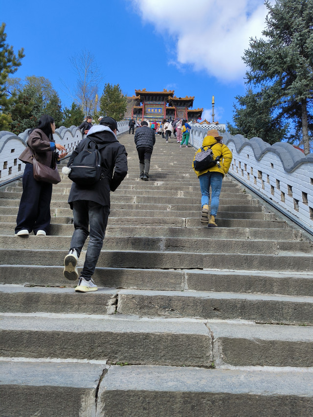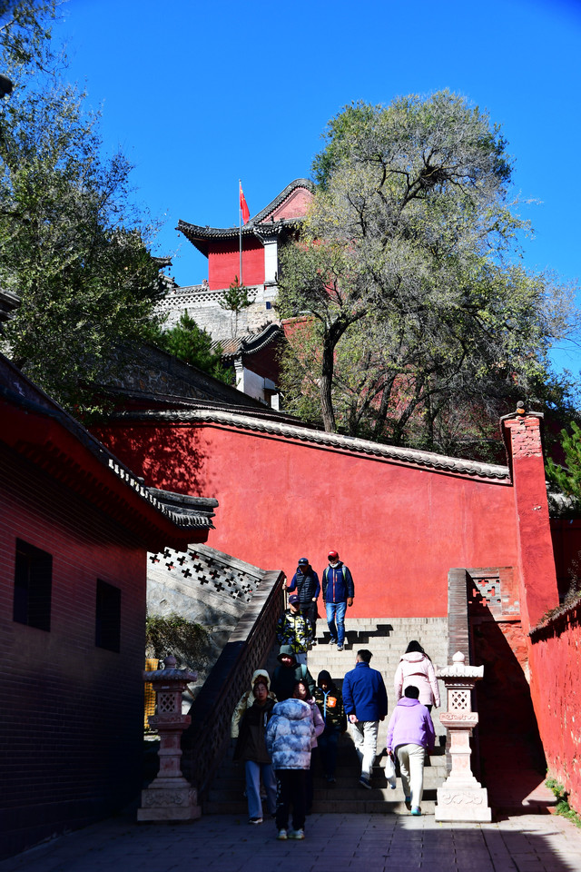 20241022,天气晴朗,一大早我们便搭乘景区交通车来到清水河畔的黛螺顶山脚。黛螺顶,原名叫青峰,创建于明代成化年间,明朝时期又称大螺顶,直到乾隆十五年间被改名为黛螺顶,一直延续到现在,是五台山历史悠久,闻名遐迩,别具一格的一座古刹。黛螺顶又称“小朝台”,是台怀寺庙中最高之处。黛螺顶所处的山峰,是五台山东台顶延伸过来的一座小山,海拔高度1938米。因台怀镇海拔1700米,黛螺顶的垂直高度只有不到300米。但站在清水河谷仰望,那坐落于高处与该山峰同名的黛螺顶古刹,相当于一幢130多层高的摩天大厦,要想登顶,绝非易事,通往黛螺顶有三个方案可以选择,1、可以骑马或步行,2、坐索道,3、登1080级台阶的“大智路”。因为索道停止使用,登1080级台阶太费体力,我们选择沿着马道步行,攀登起来没有那么费劲,我们边走边拍照边休息,用了一个多小时才到达黛螺顶。沿途一步一景,风光无限:阳光明媚,蓝蓝的天空、皑皑的台顶、金灿灿的树木、红墙金顶的寺庙。。。组成了一幅幅五台山初冬的美丽画卷,五台山真美呀!(门票8元,60岁以上免票)