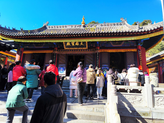 五台山显通寺大雄宝殿,重顶飞檐,巍峨宽大,占地约670平方米,为五台殿宇之最,木雕彩绘,肃穆堂皇。殿内佛像高大,金碧辉煌。五台山的重大法事活动,多在此殿举行,届时,各寺都有僧人参加。