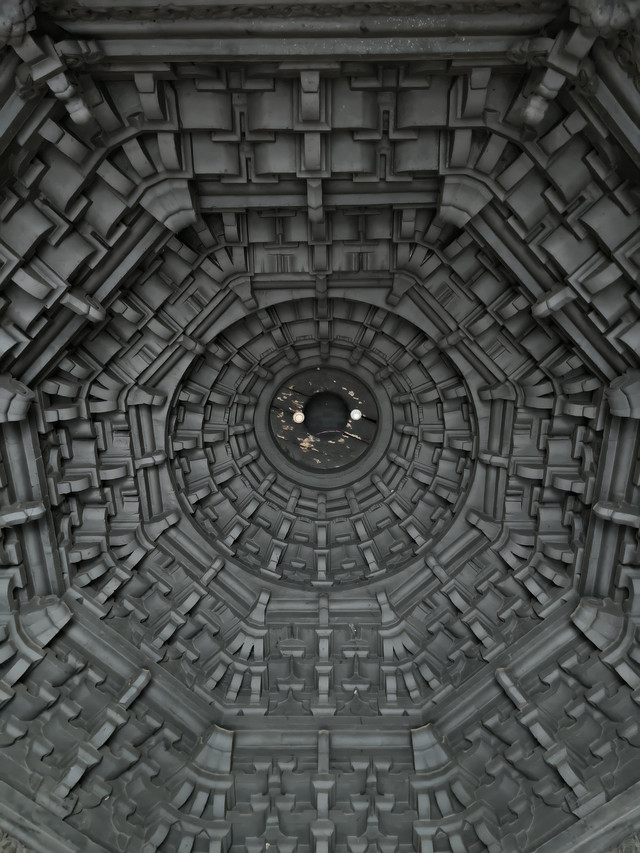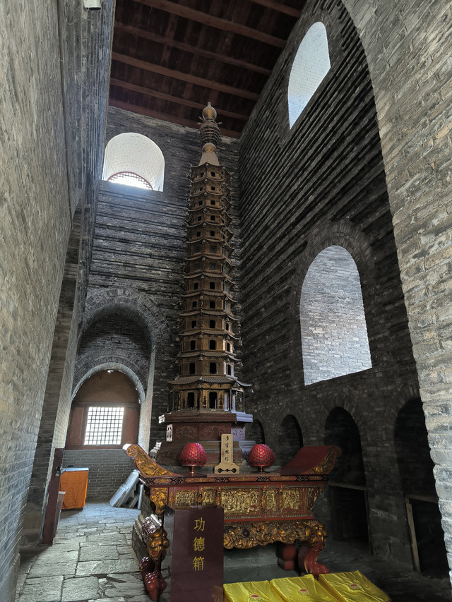无量殿面阔七间,进深四间,从外面看是七间两层楼房,殿内却是三间穹窿顶砖窑,型制奇特,雕饰精细,宏伟壮观。殿四壁全用青砖砌就,殿顶用方木砌就。