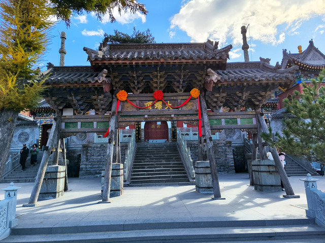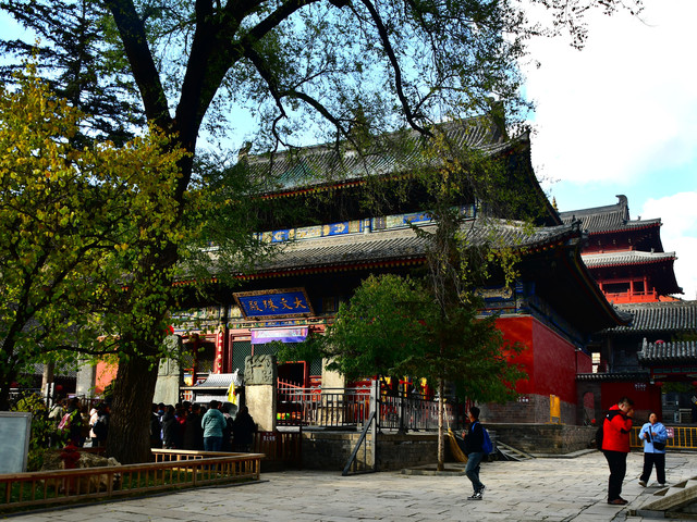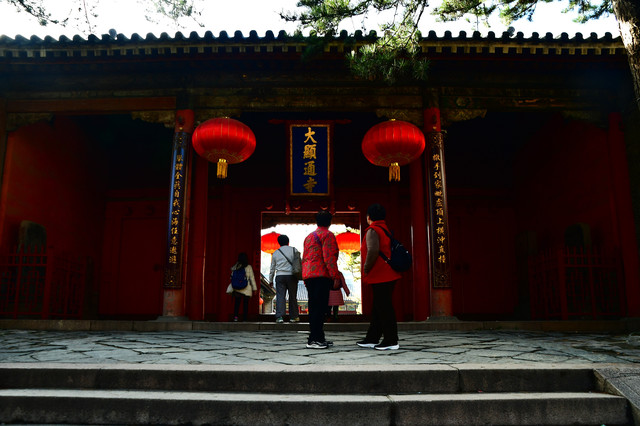 显通寺始建于东汉永平十一年(68年),北魏时称灵鹫寺。唐代称大华严寺。明初赐恩贝大显通寺,万历中改永明寺。清康熙二十六年(1687)复名大显通寺。占地面积占地面积约8万平方米,拥有殿堂楼阁禅房僧舍等400余间。是五台山历史最悠久、规模最大的寺庙。现存建筑均为明、清异构。中轴线上一连七进殿堂,从南到北依次为观音殿、大文殊殿、大雄宝殿、无量殿、千钵文殊殿、铜殿、藏经楼,七重殿宇各具特色,辉煌壮丽。(门票10元,60岁以上免票)